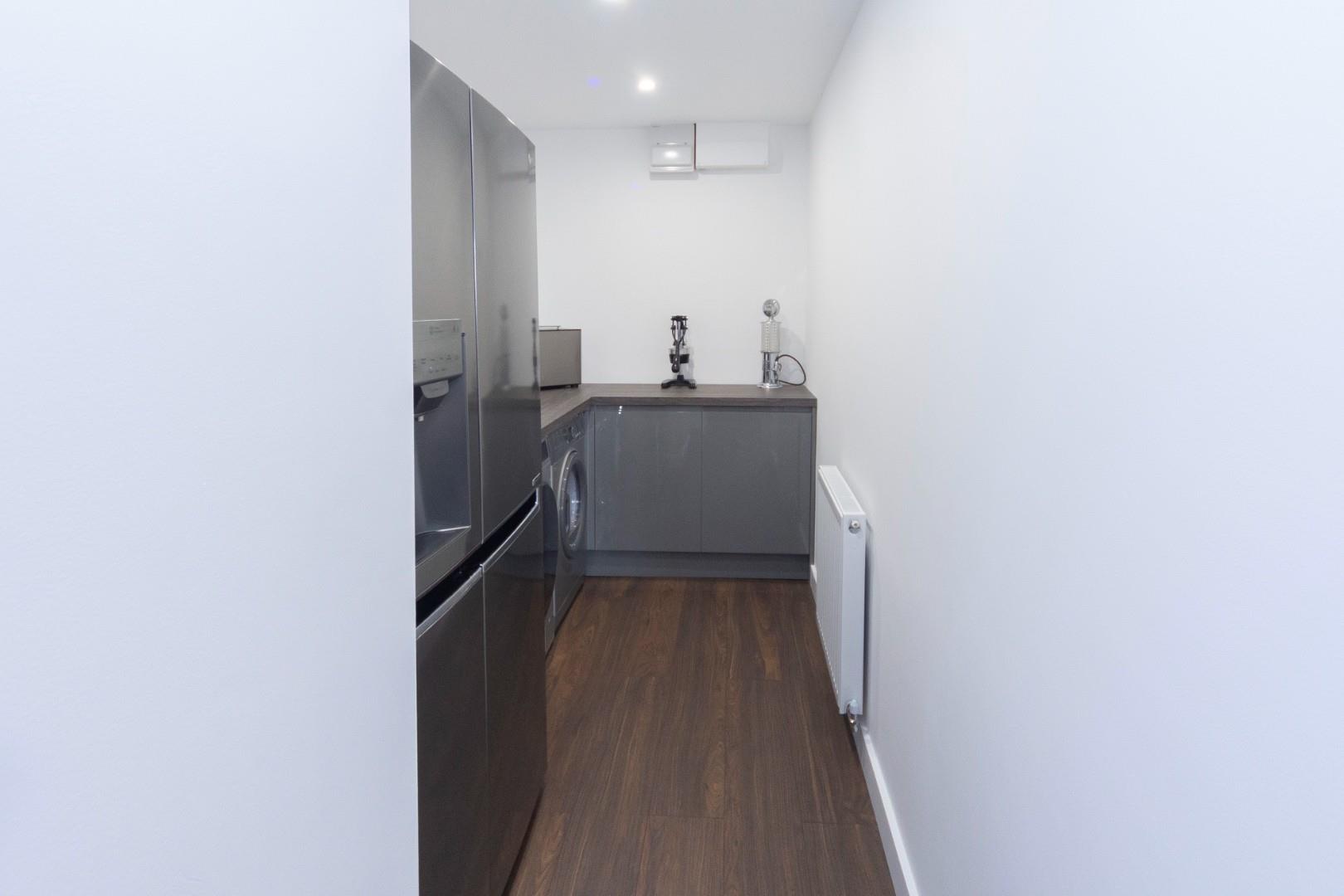 Is equipped with base cupboards with attractive work tops over, there is provision for washing machine, tumble dryer and ample space for an American fridge freezer, there is a radiator and recessed ceiling down lights.