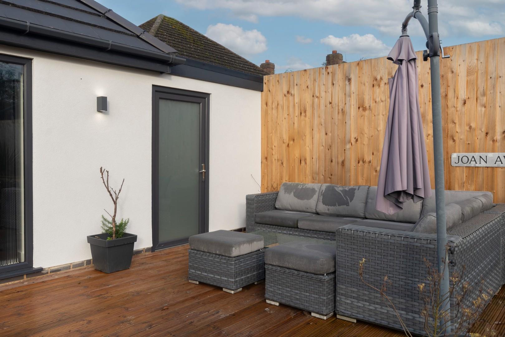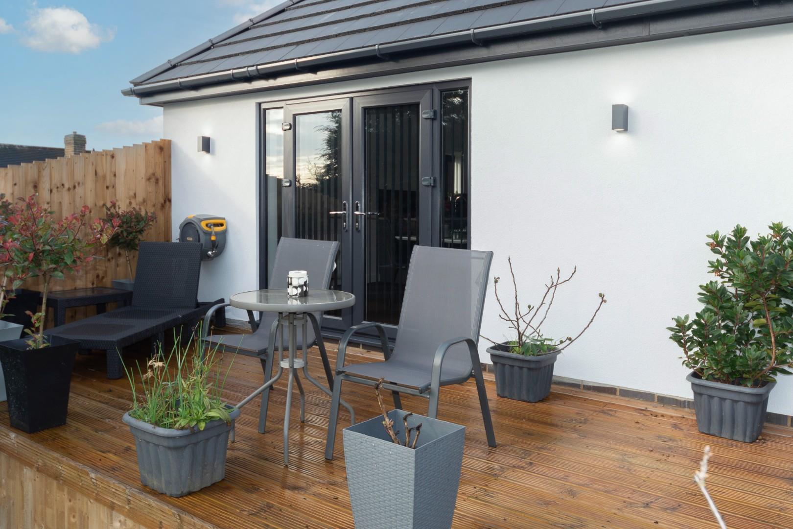 Outside is ample parking to the front for four to five vehicles, depending on size, and to the rear is a lovely, very private rear garden with a decked patio, lawn, and mature trees and shrubs. There is also a door opening into the attached garage.