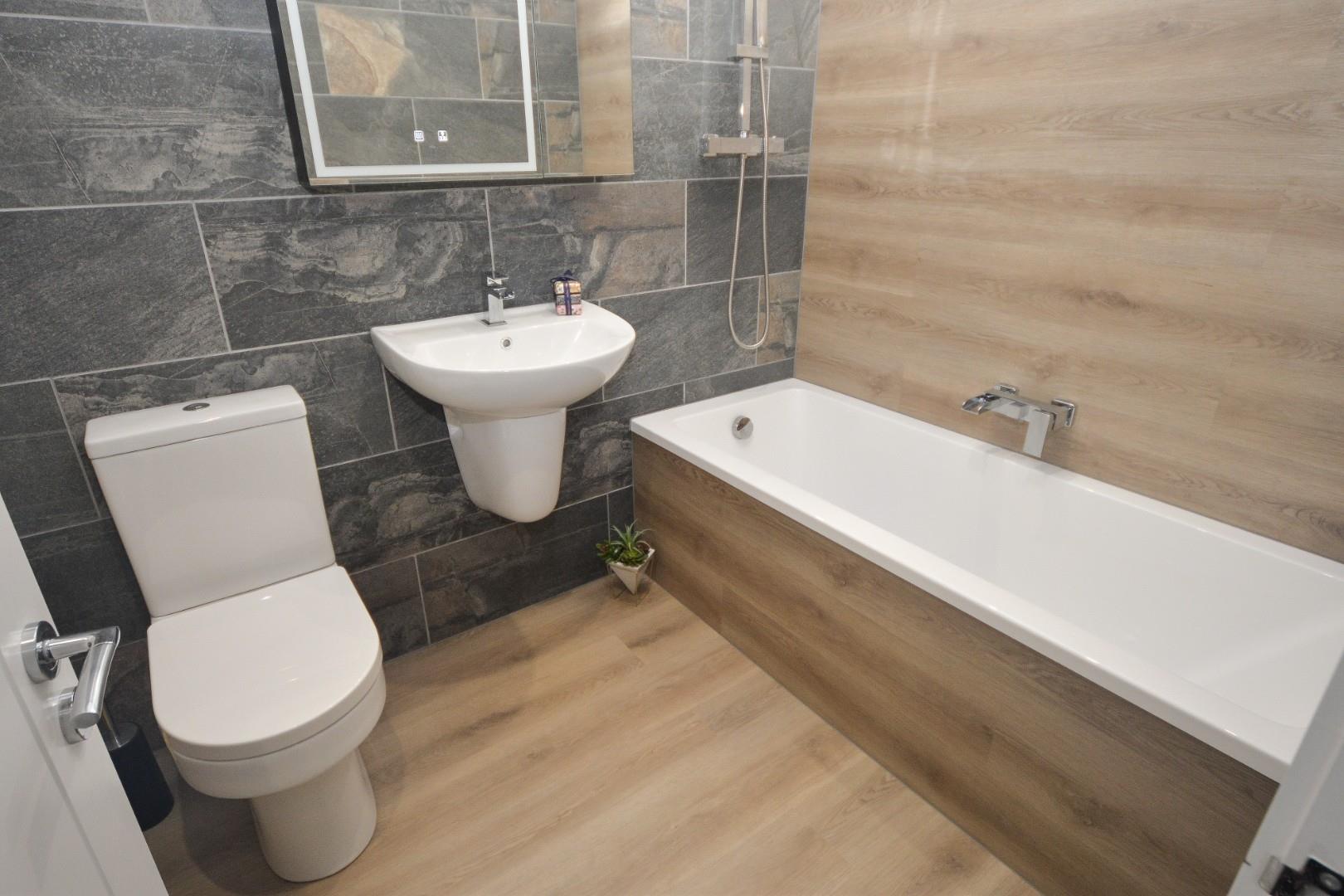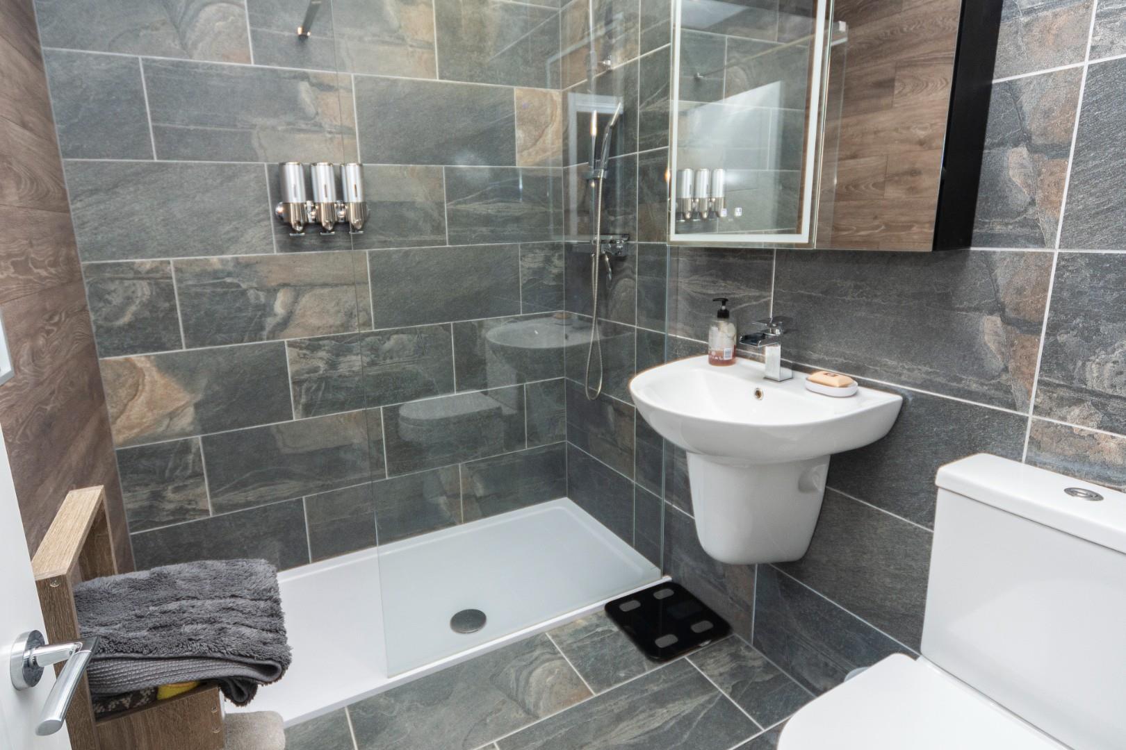 This beautifully equipped room has attractive tiled walls and matching flooring, there is a large wall in shower with dual shower heads, wall mounted hand wash basin with waterfall taps and W.C., there is a large heated chrome towel rail, obscure window to the rear aspect and recessed ceiling down lights.