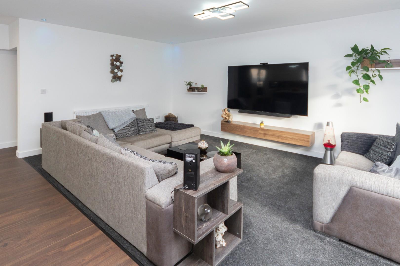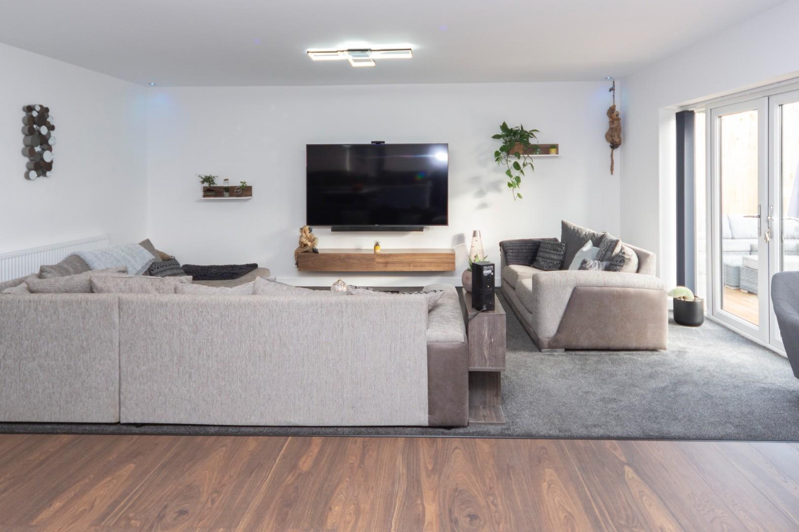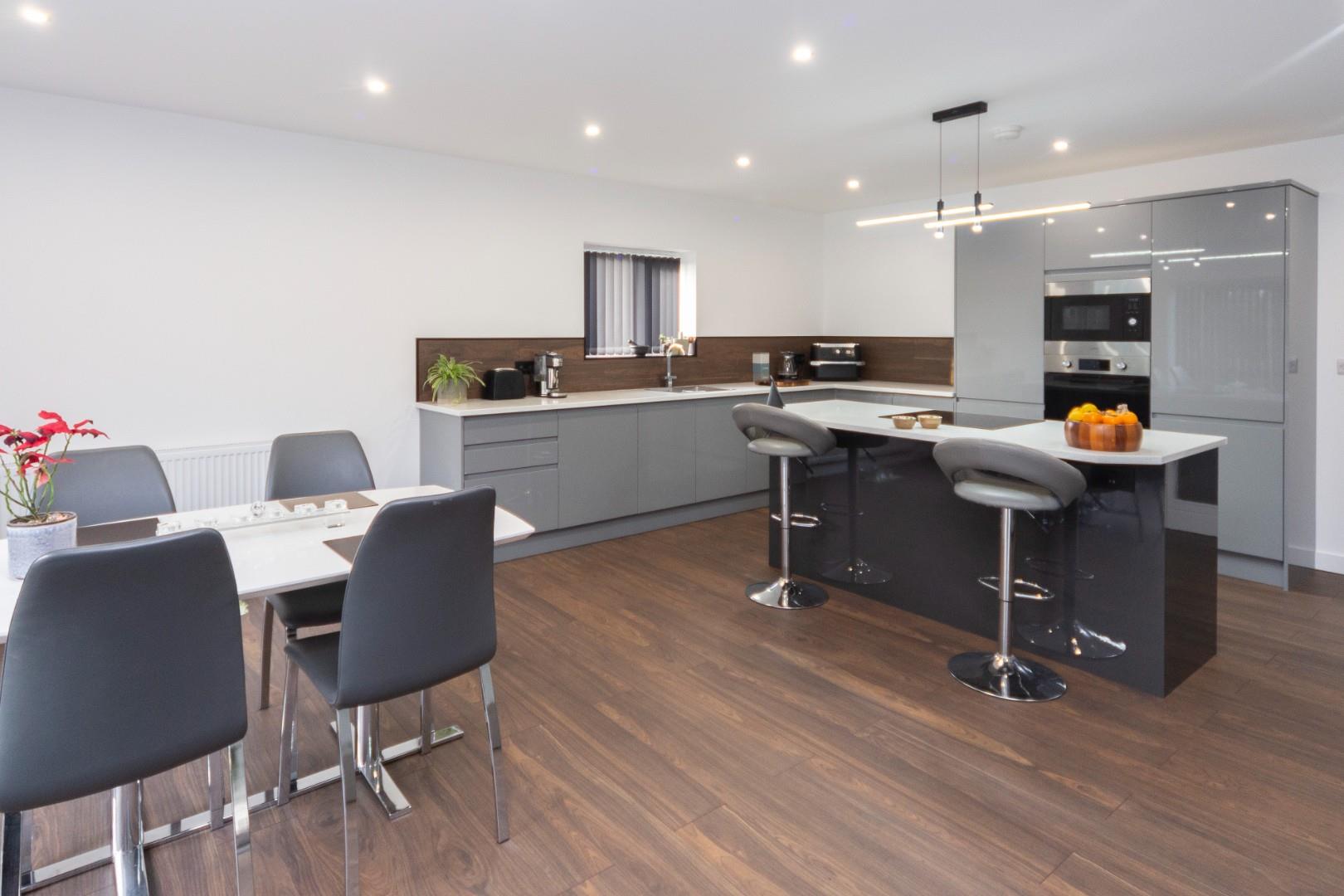Absolutely superb space with lots of light coming in through the doors, there are two sets of French doors with glazed screens, window to the side aspect, ample space for sofas, chairs and dining room table. The kitchen is fitted with a range of grey high gloss base cupboards, drawers, there are quartz work tops that are inset with a stainless steel sink and island unit with a four ring electric hob, integrated appliances include oven, microwave and dishwasher, there are recessed ceiling down lights and radiator.