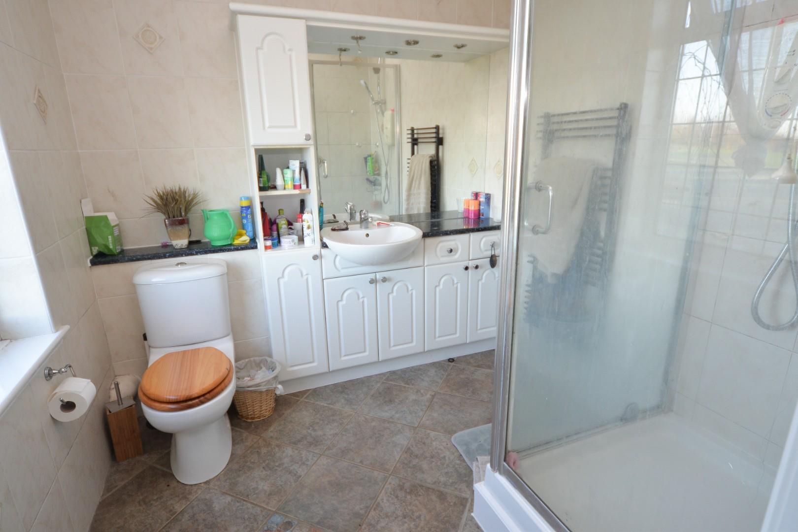 Is fitted with a range of vanity units with hand wash basin inset, W.C. and large fully tiled shower enclosure, there is tiled flooring and a window looking out over the rear aspect.