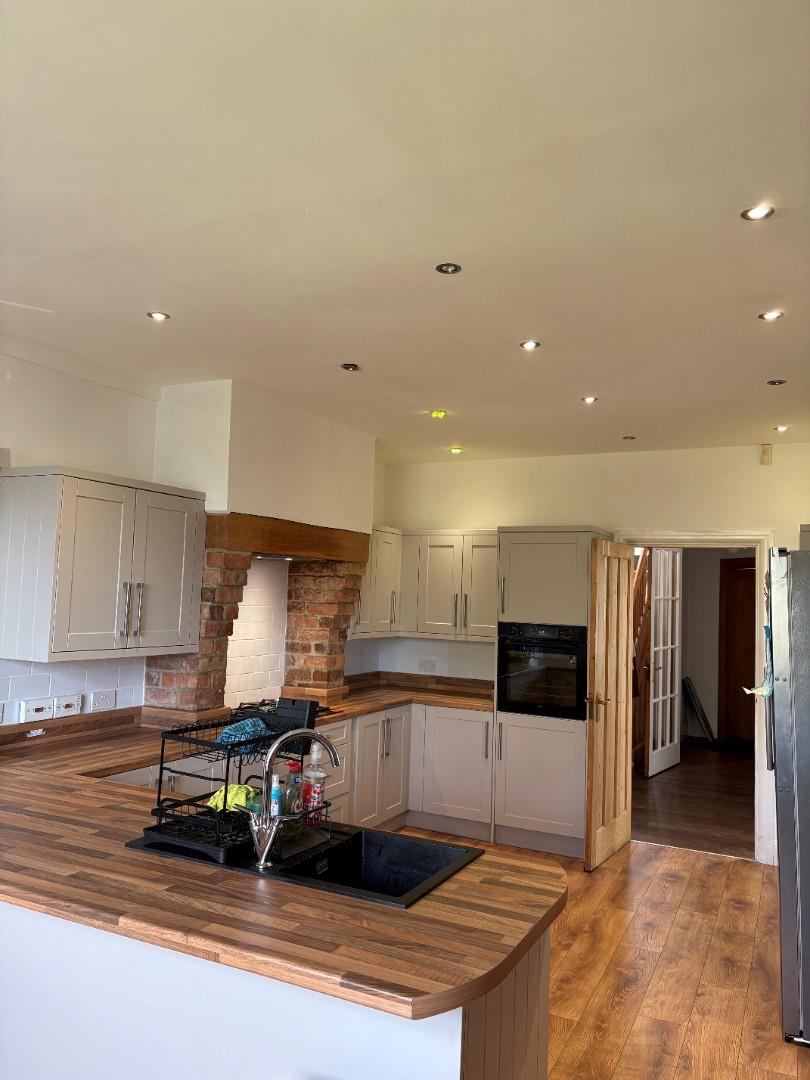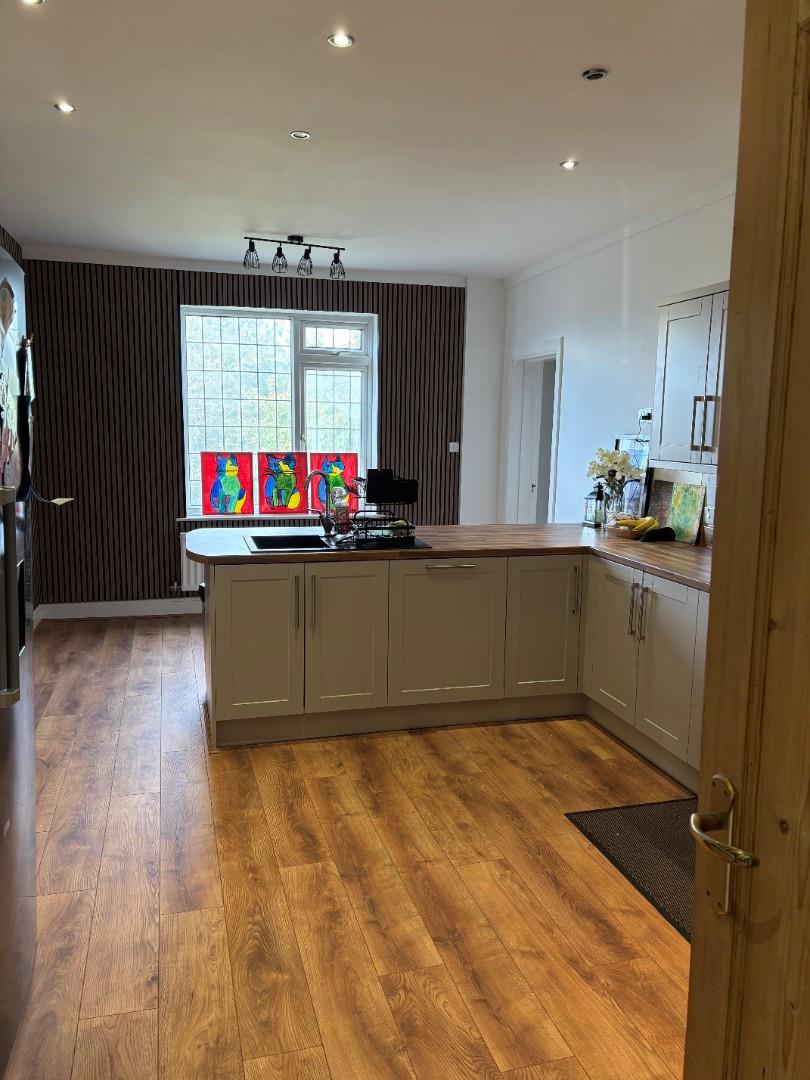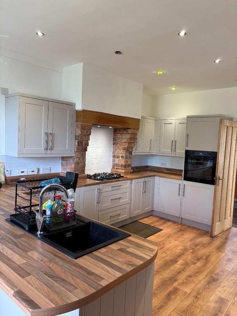 This recently fitted kitchen has a range of base cupboards, drawers and wall mounted cabinets, new counter tops incorporate black one and a half sink, five ring gas hobs with new interagted appliances that include an oven, dishwasher and microwave. There is space for fridge freezer, window to the rear aspect over looking the garden, radiator, new flooring and a door leads through to the rear porch.