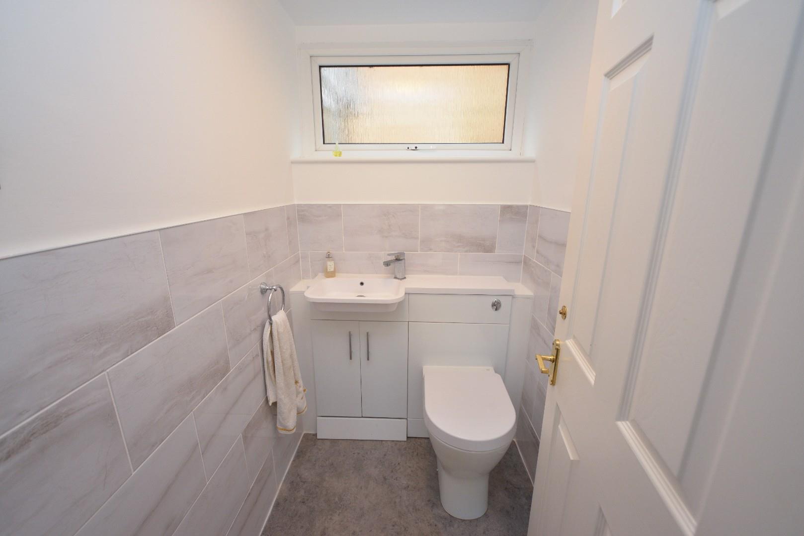 Has a highline obscure window to the side aspect. Fitted W.C and a moulded hand wash basin set within a vanity unit. There are tiled surrounds and ceiling light points.