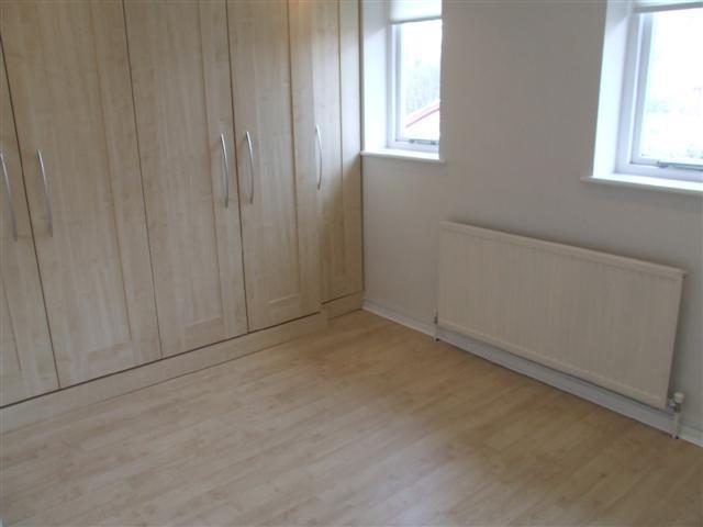 With central heating radiator, wood grain effect laminate flooring, full width fitted wardrobes providing shelving and two windows to the rear aspect.