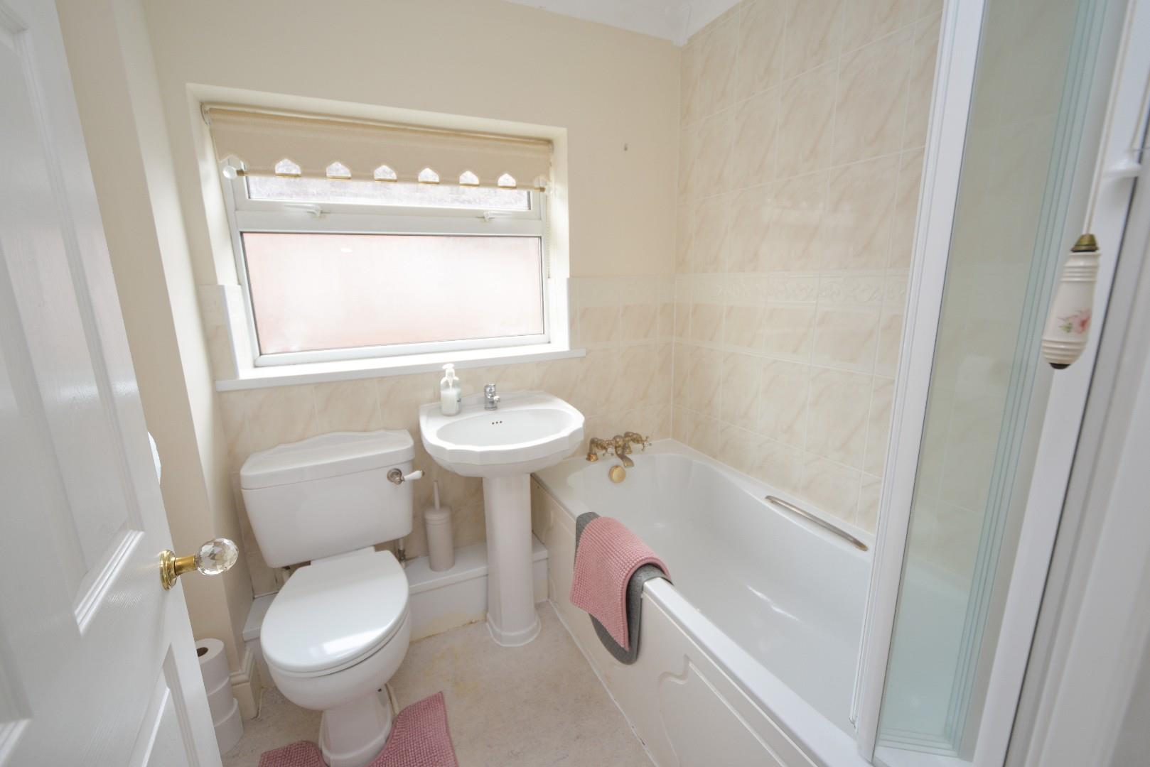Is fitted with a panelled bath with mixer taps, there is an electric shower over with glazed screen, pedestal hand wash basin, W.C., there are tiled surrounds, obscure window to the side aspect, coving to ceiling, radiator and ceiling light point.