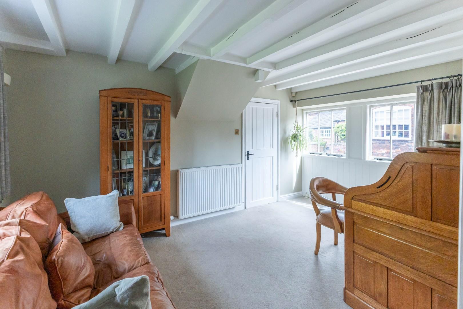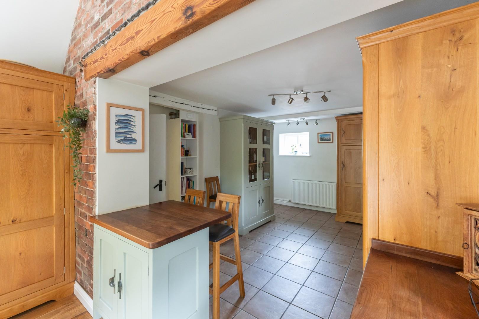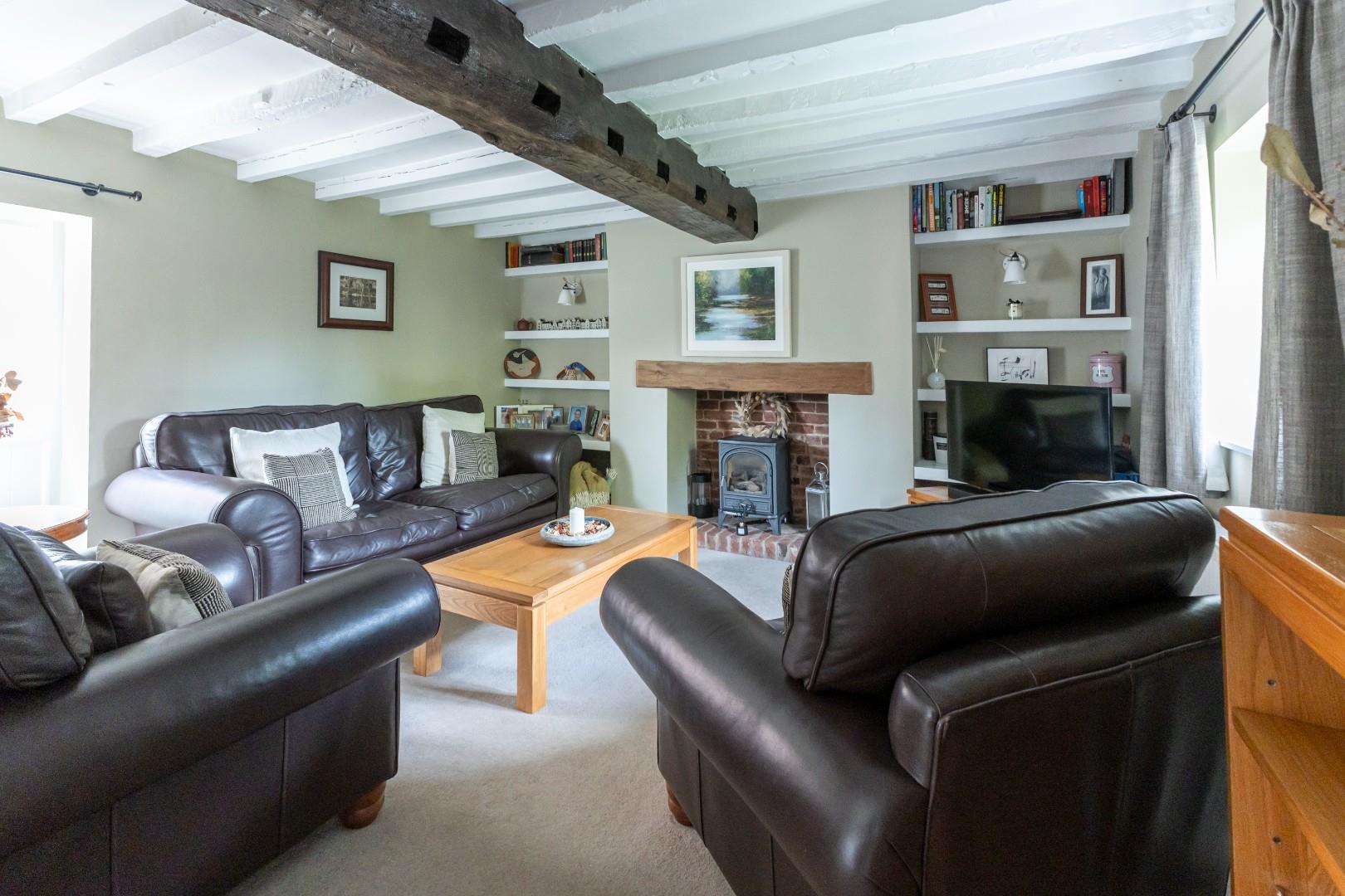 Upon entering the barn, you are welcomed into an entrance hall that features a useful boot cupboard, stairs leading to the first floor, and doors opening to the kitchen and study/reading area. The study/reading room is a lovely space for quiet relaxation or study and opens into the charming sitting room. The sitting room boasts lovely neutral décor, bespoke shelving within the chimney breast, and an electric log-style burner resting on a raised brick hearth.