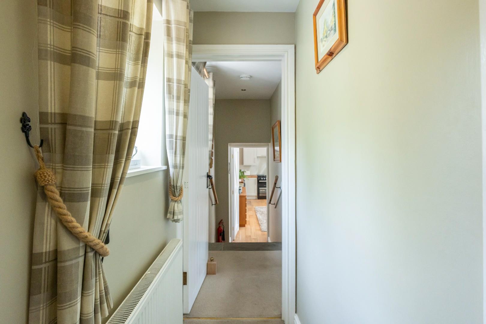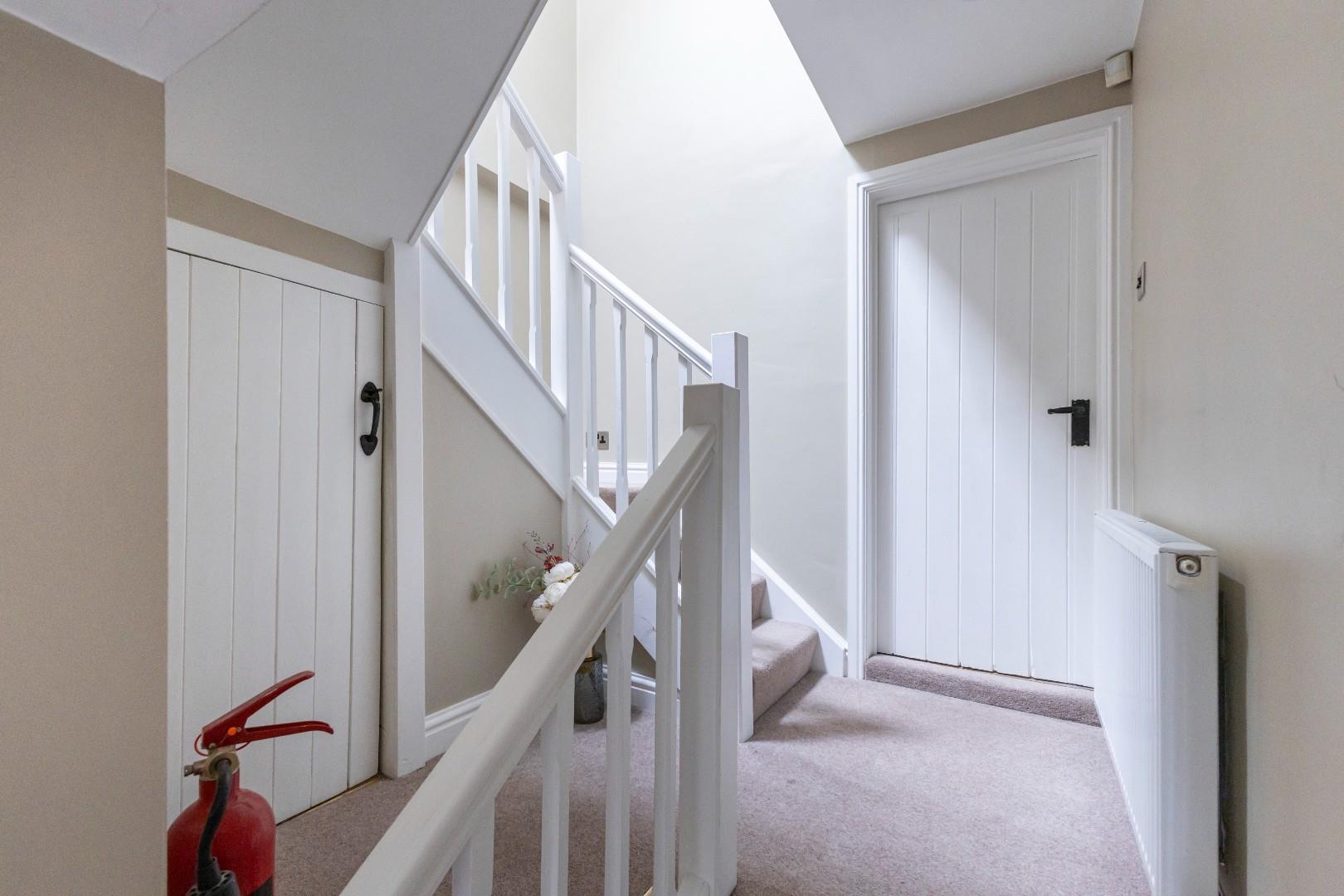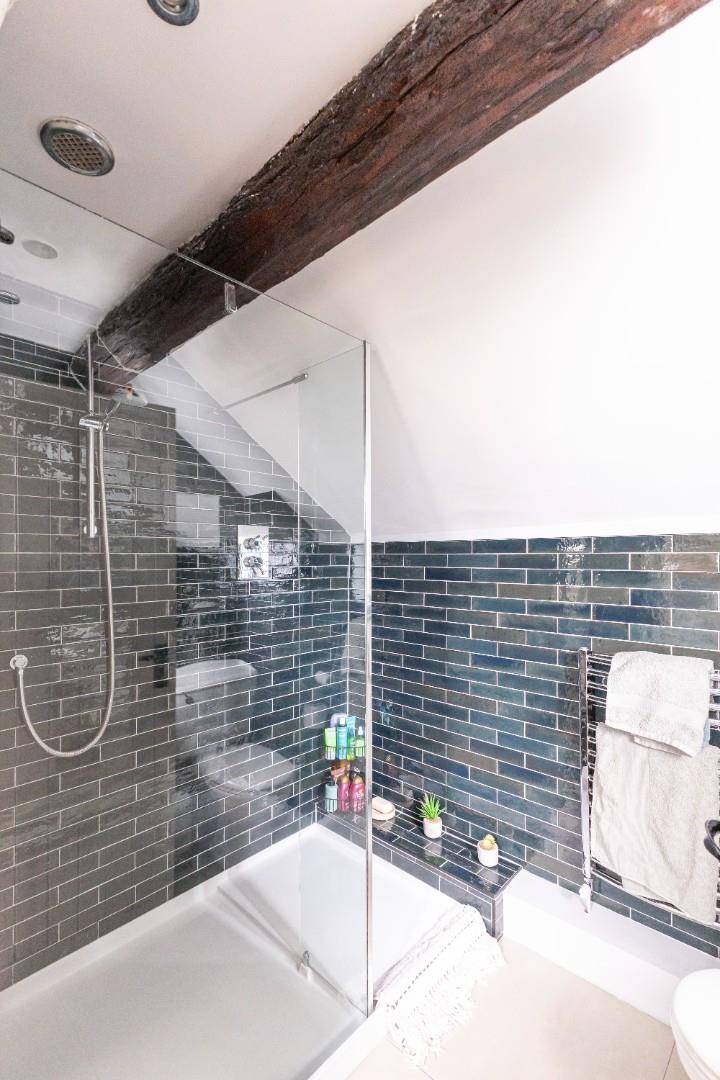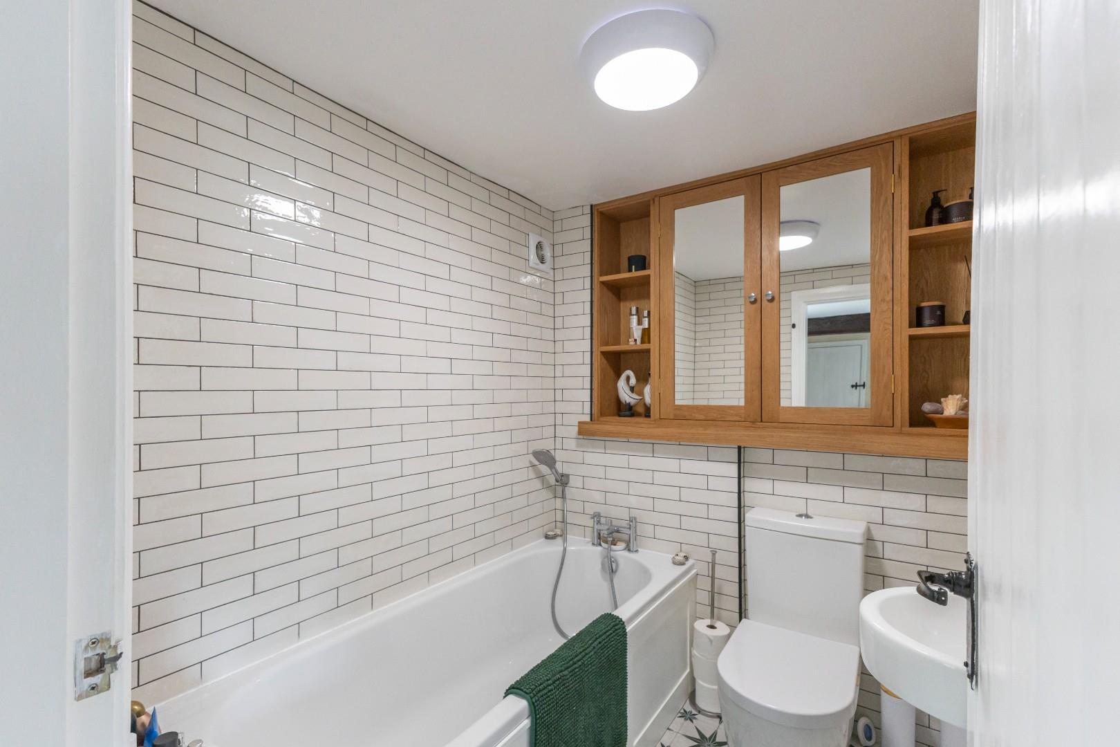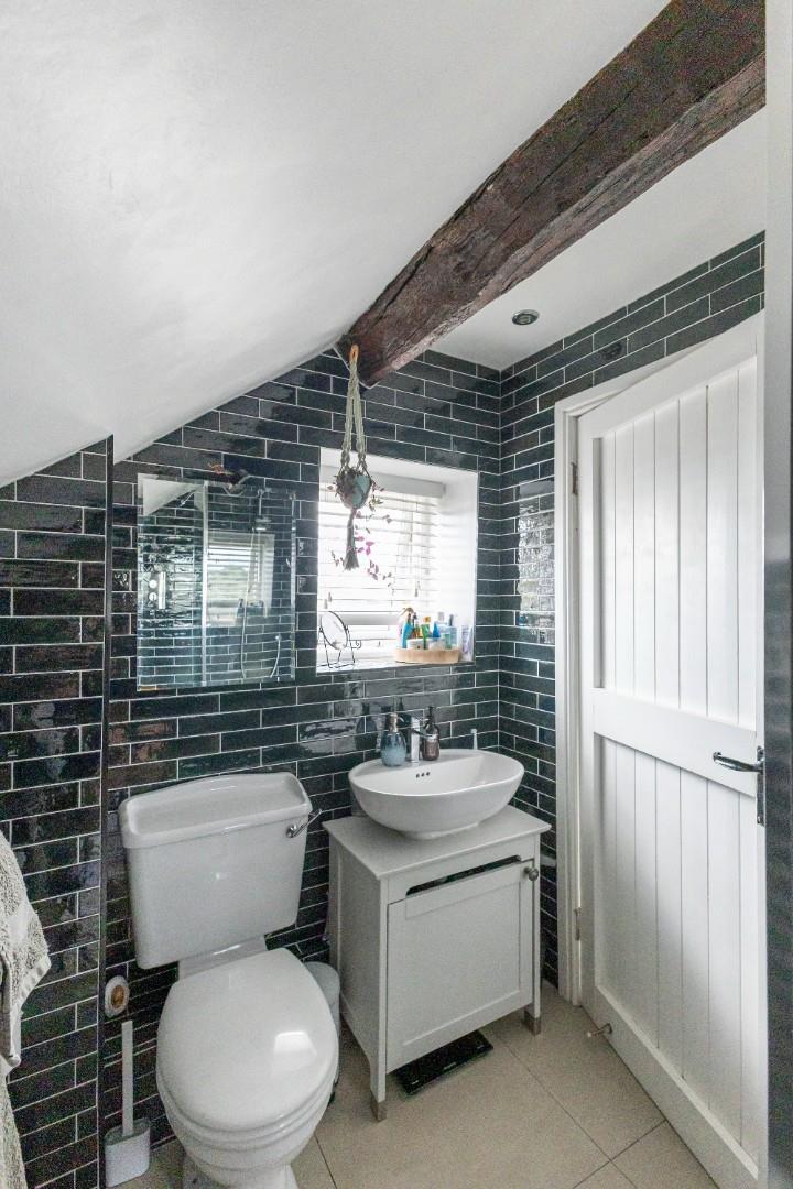 The second floor opens into a spacious guest bedroom with a built-in wardrobe and a superbly presented shower room, which features attractive subway-tiled walls, a shower, wash hand basin, and W.C.