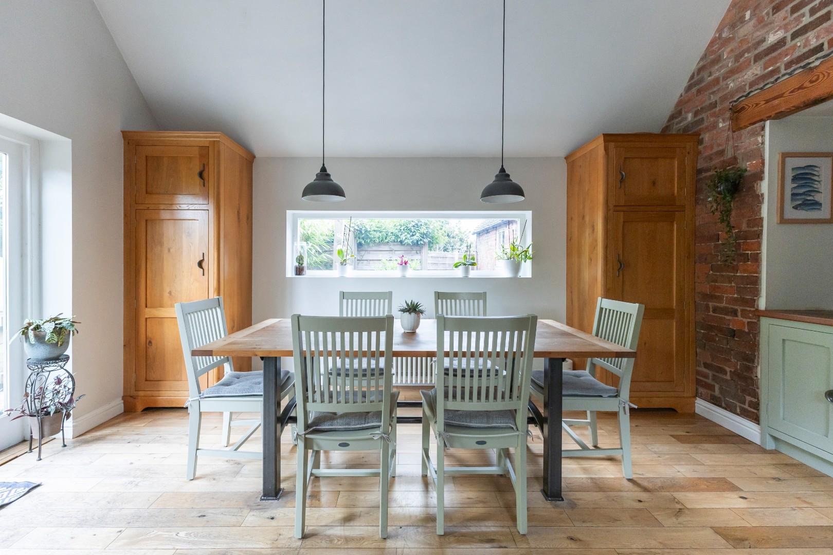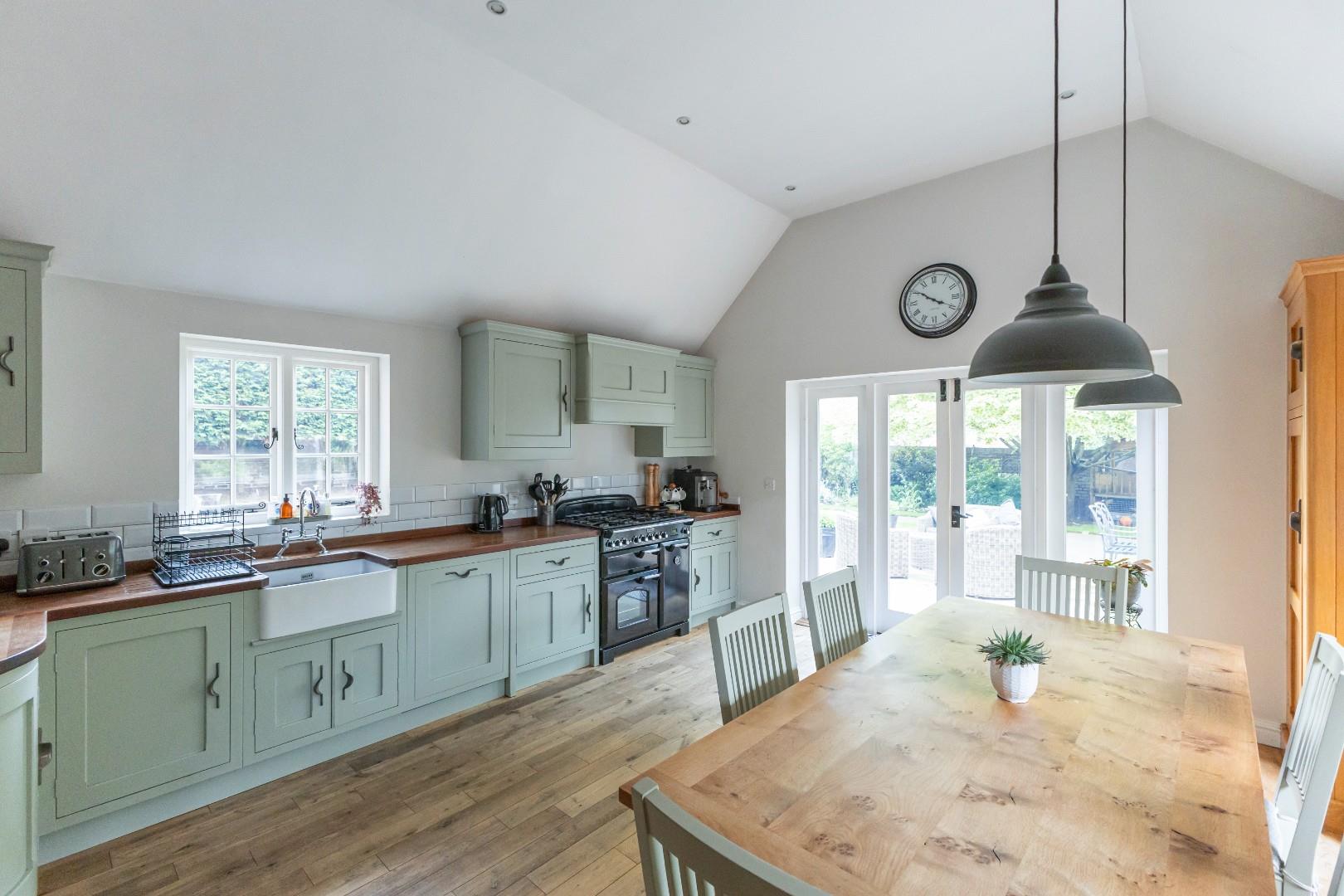 The impressive kitchen and dining area provide a fantastic space for entertaining. This room features a high ceiling with light flooding in through the windows and bi-fold doors that offer views of three sides of the garden. The bespoke kitchen is built with oak and includes natural and painted oak units complemented by attractive walnut countertops that house a Belfast sink. It is equipped with a range cooker, a built-in dishwasher, a double fridge, and a double freezer. This space offers ample room for a dining table and chairs, along with a useful cupboard that accommodates both a washing machine and a tumble dryer.