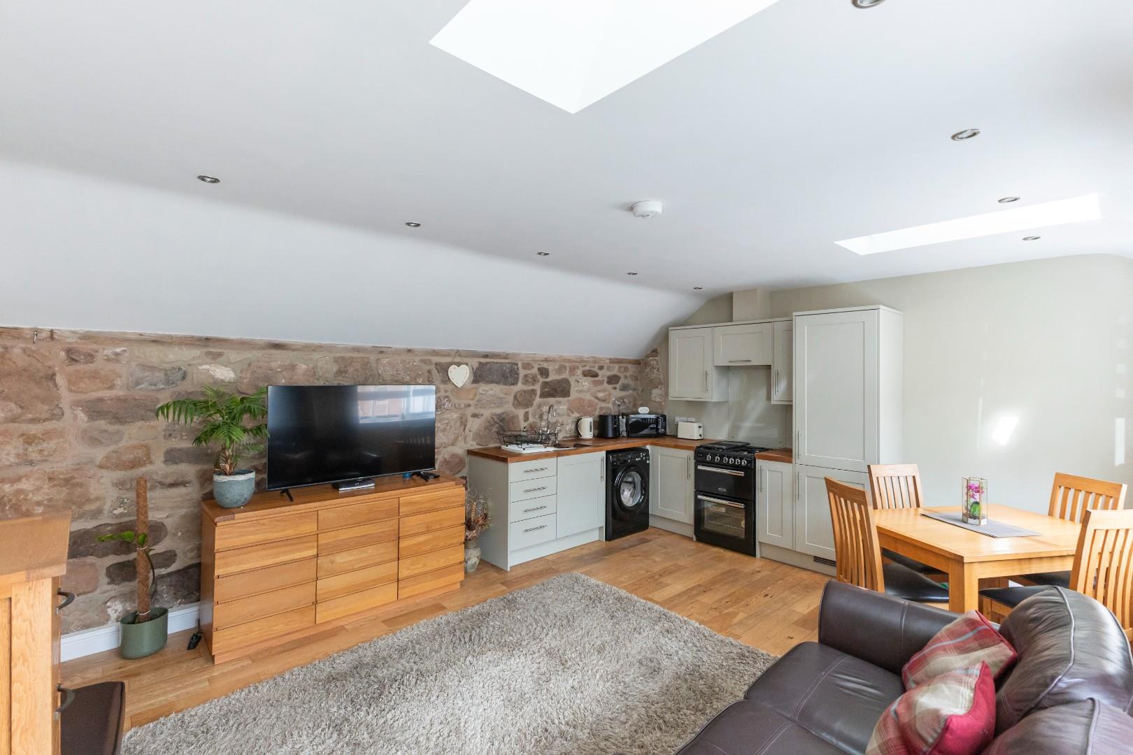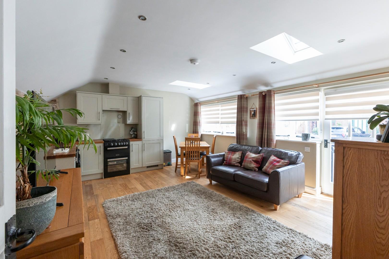 A door from the kitchen leads to the annex area, where you will find two bedrooms along with a ground-floor shower room. The final door opens into a superb open-plan kitchen, living, and dining area with its own entrance door, showcasing a stunning exposed stone wall and fitted with modern kitchen units and appliances.