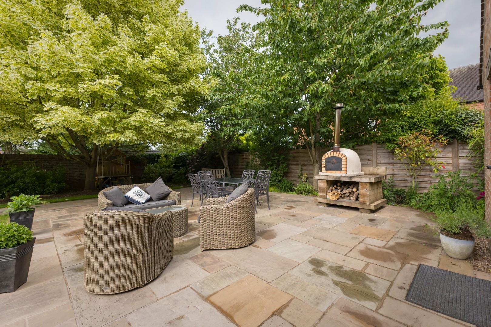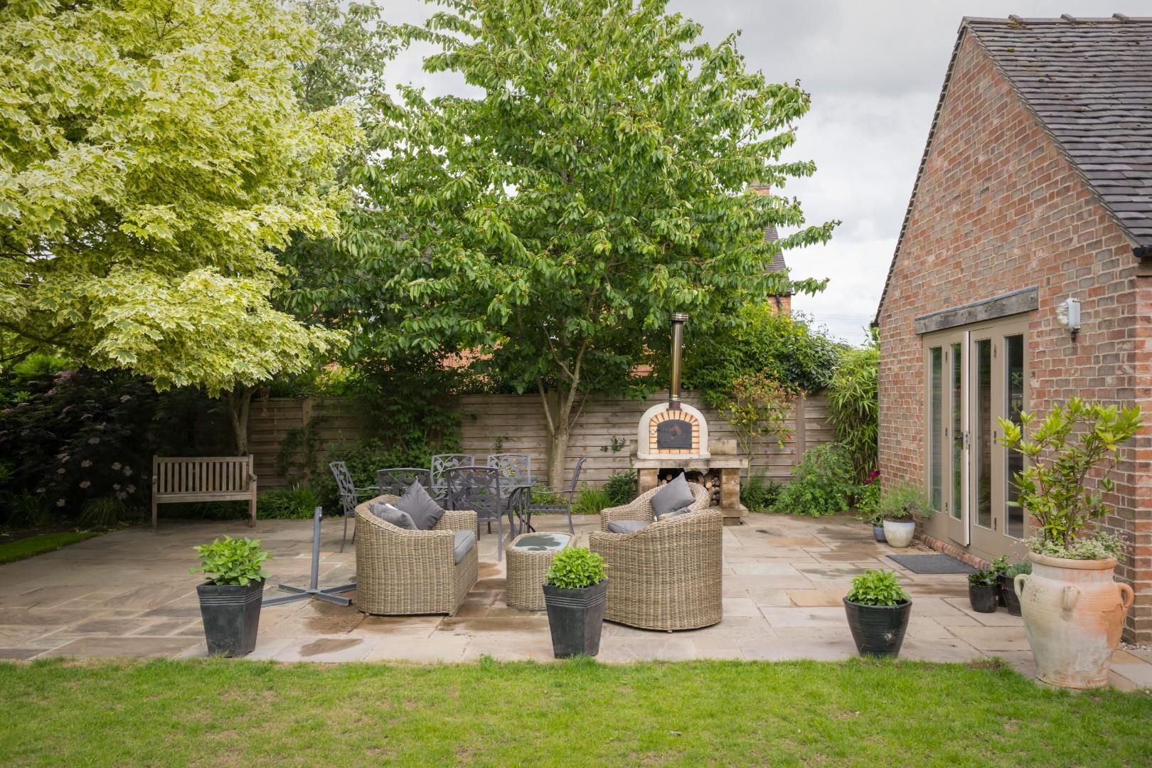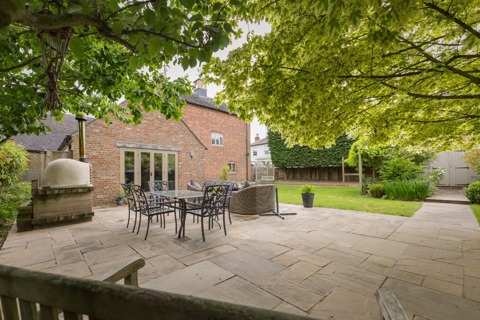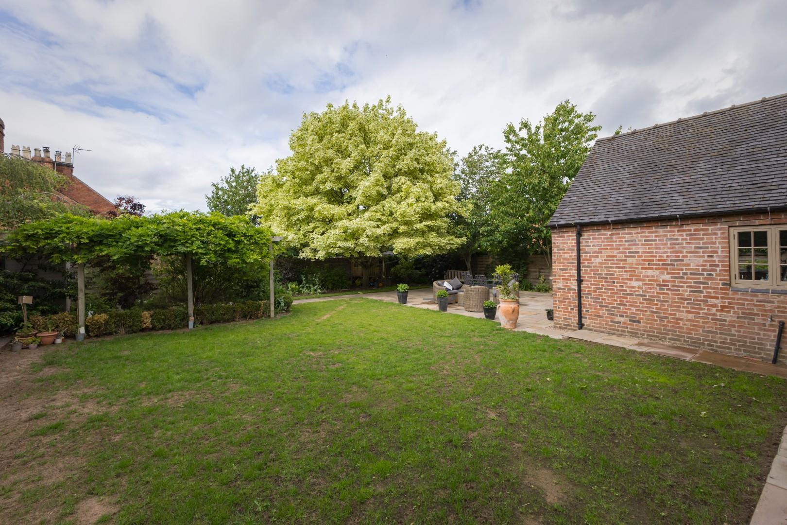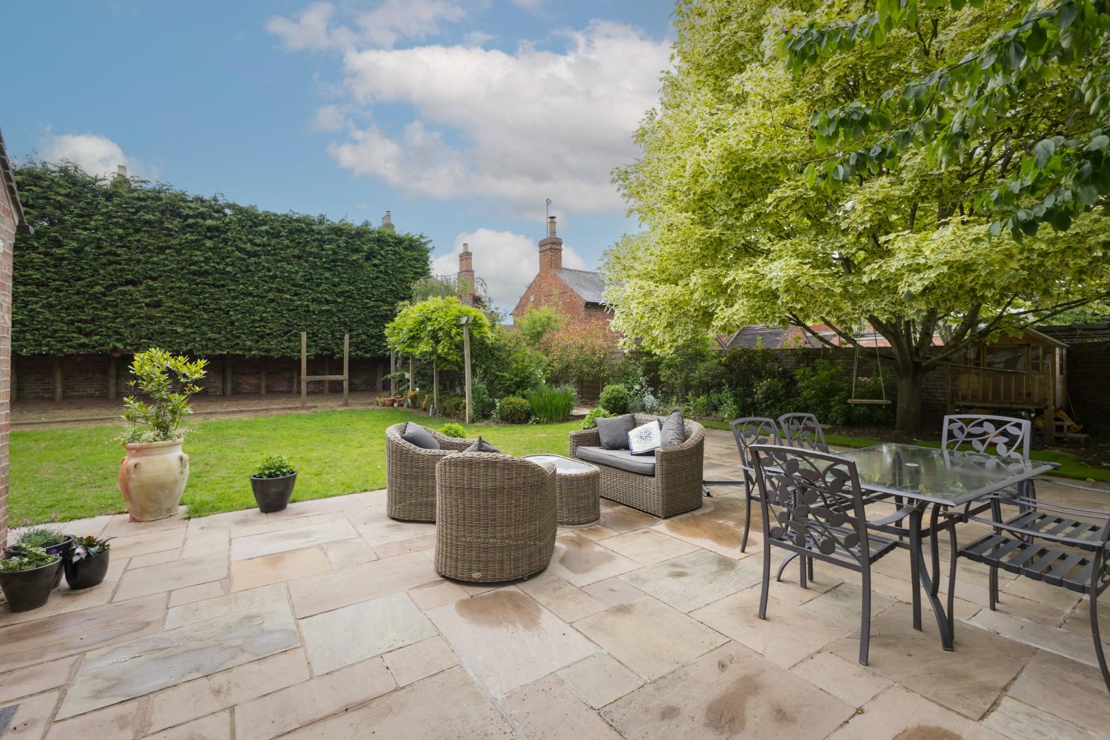 The rear gardens are delightful, featuring a large terrace ideal for entertaining, a lawn, mature trees and shrubs, and space for sheds and a greenhouse.