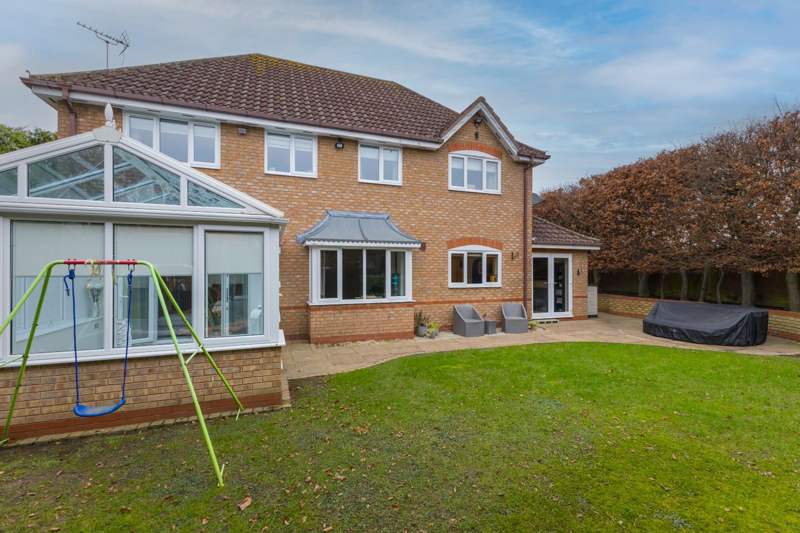 The gardens are a true highlight, featuring a spacious lawn at the front and a beautifully shaped lawn with a terrace at the rear, offering plenty of room for family activities and outdoor enjoyment.