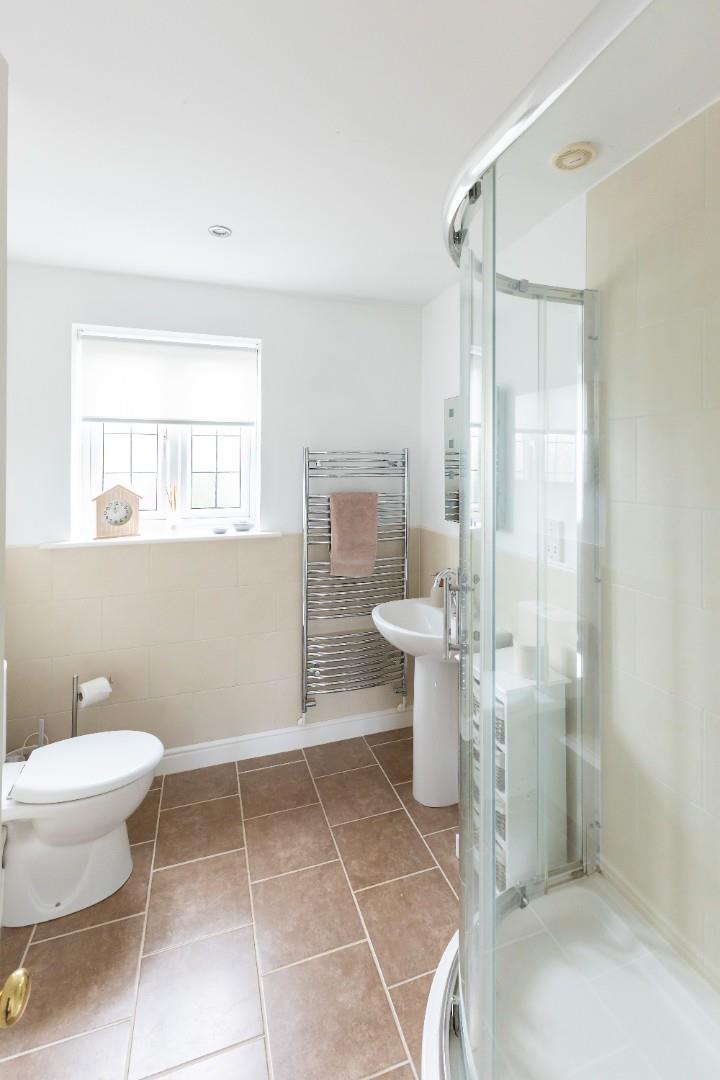Is equipped with a large corner shower enclosure with glazed screen, pedestal hand wash basin and W.C., there are tiled surrounds, chrome heated towel rail and recessed ceiling down lights.