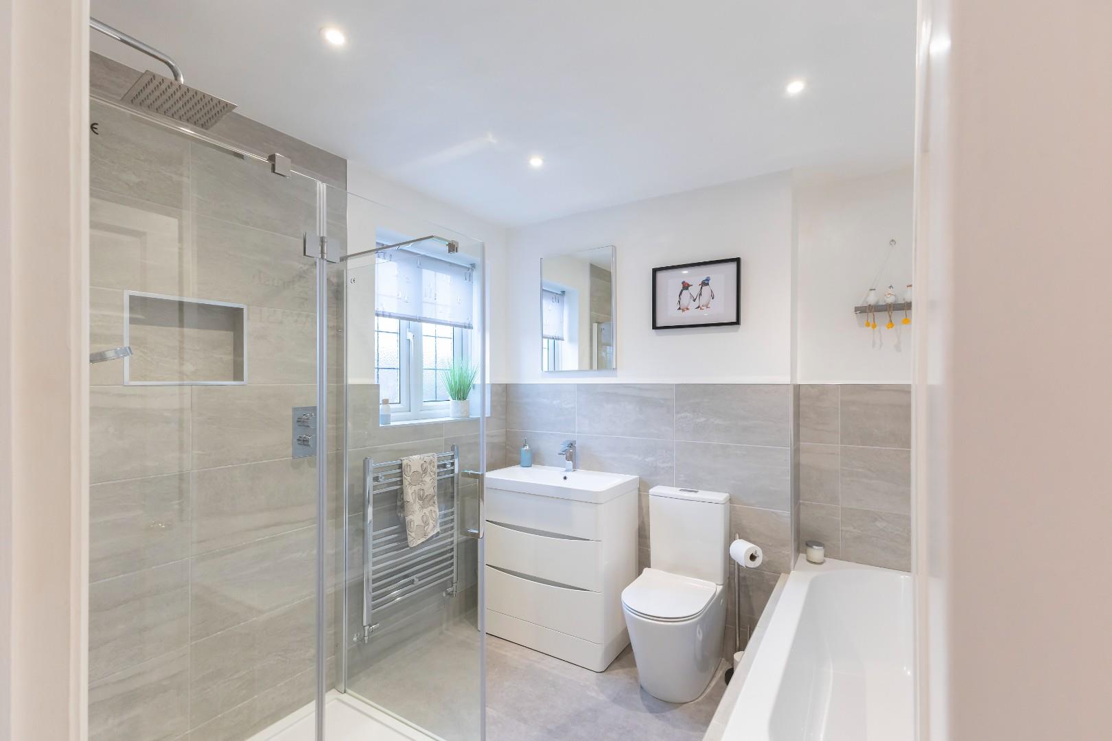 Has a large fully tiled enclosed shower enclosure with waterfall and hand held heads, large bath with waterfall taps, vanity unit with hand wash basin with waterfall taps inset and W.C., there are tiled surrounds, obscure window to the front aspect, recessed ceiling down lights and useful storage cupboard with open shelf displays.