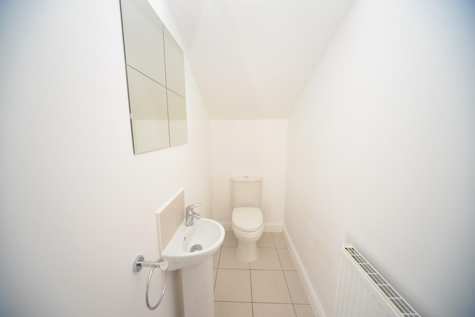 Has tiled flooring, W.C., pedestal hand wash basin with tiled splashbacks, ceiling light point and radiator.