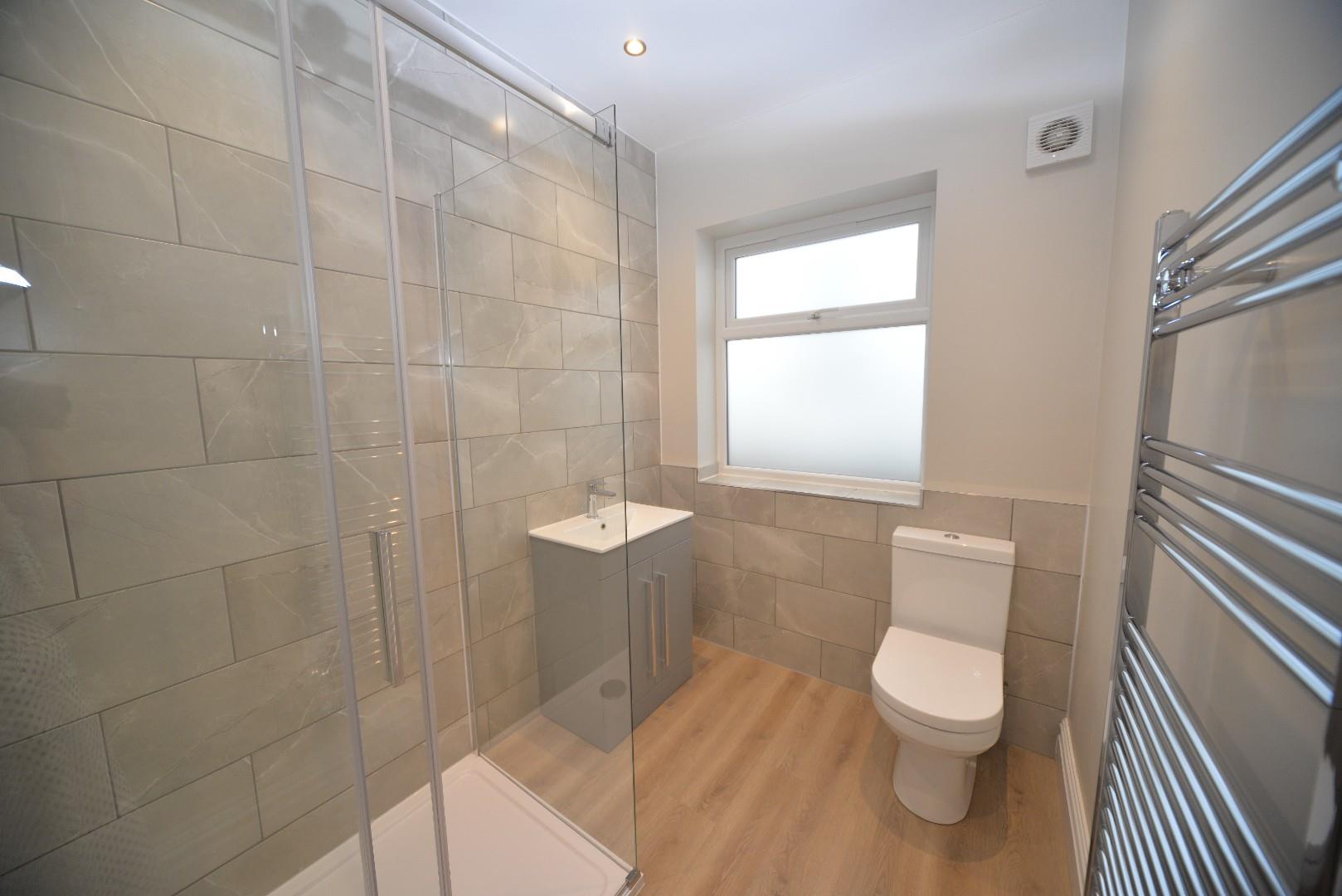 Has a large shower enclosure with glazed screen, vanity unit with hand wash basin inset and W.C., there are attractive tiled splashbacks, obscure window to the side aspect and heated chrome towel rail.