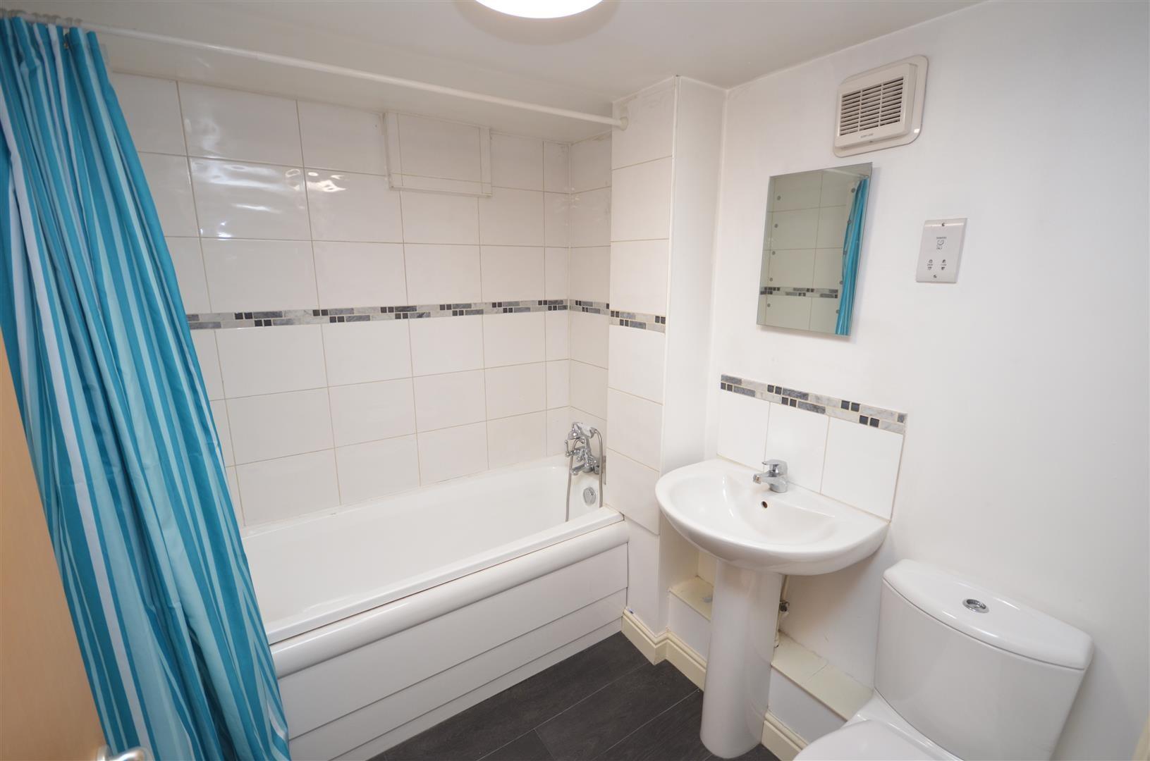 Fitted with a contemporary white three-piece suite comprising a panel bath with shower attachment, pedestal hand wash basin, wc, radiator, extractor fan and tiled splash backs.