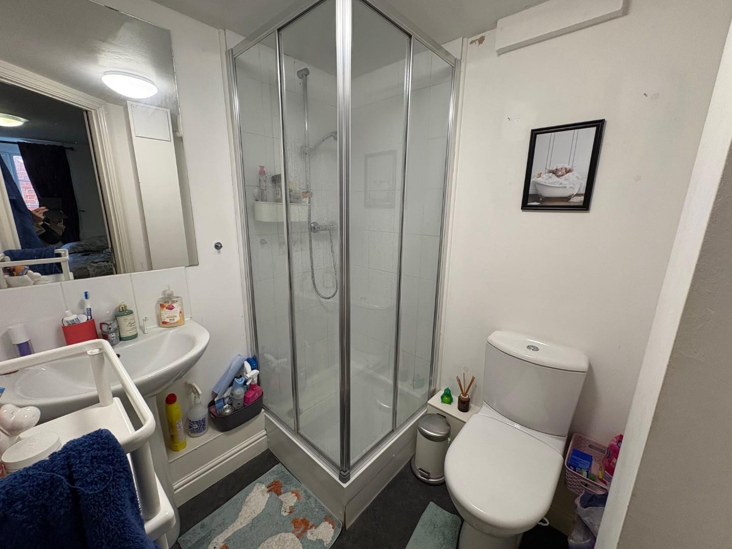 It is fitted with a contemporary white three-piece suite comprising a shower cubicle with mixer shower, pedestal hand wash basin, WC, extractor fan, and tiled splashbacks.