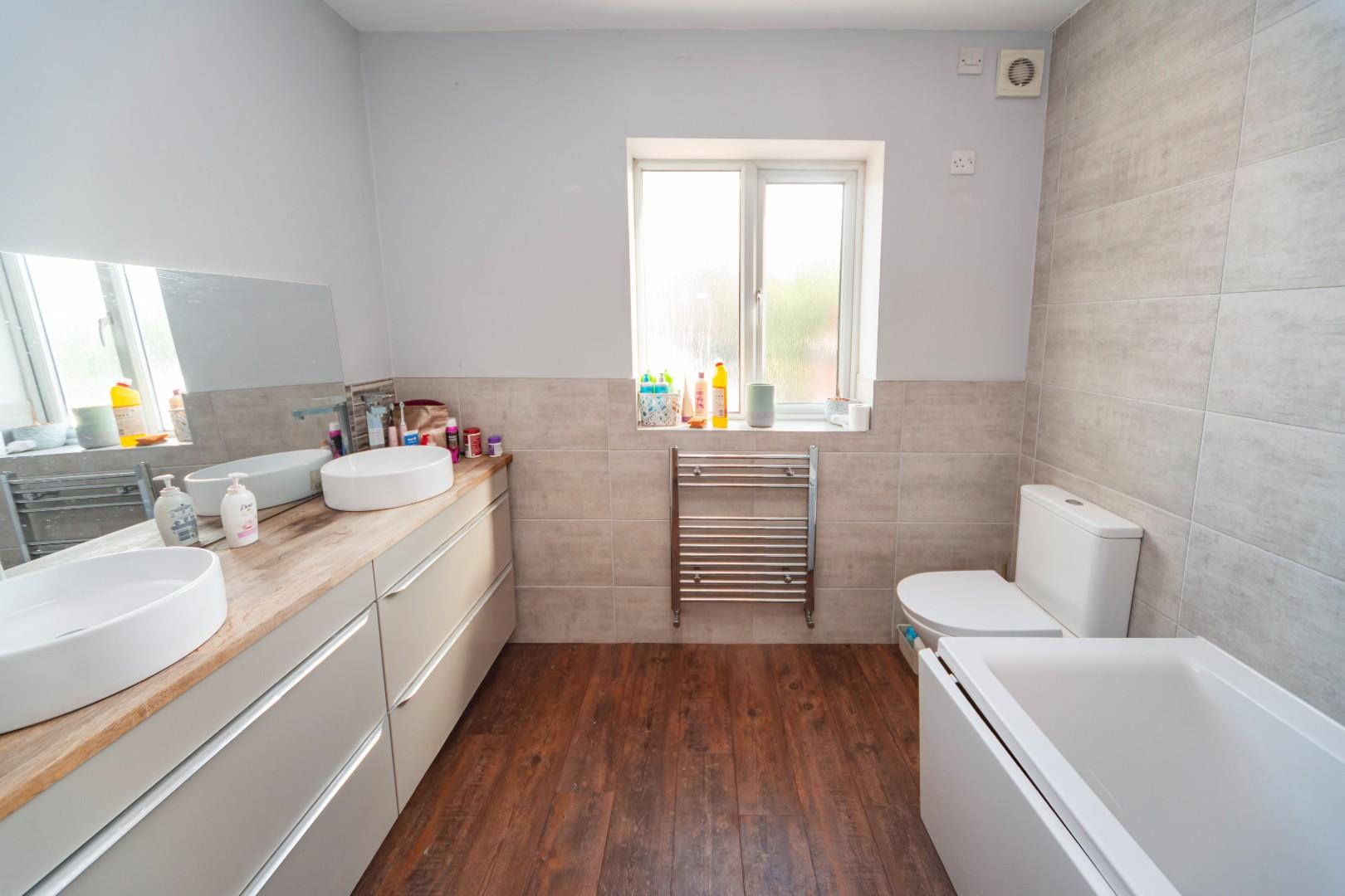 Has a pea shaped bath with mixer taps and hand held shower and a further plumbed in shower with glazed screen, there is a W.C., heated chrome towel rail, obscure window to the rear aspect, recessed ceiling down lights and a range of vanity units with timber worktops with his and hers sinks, and mixer taps over.