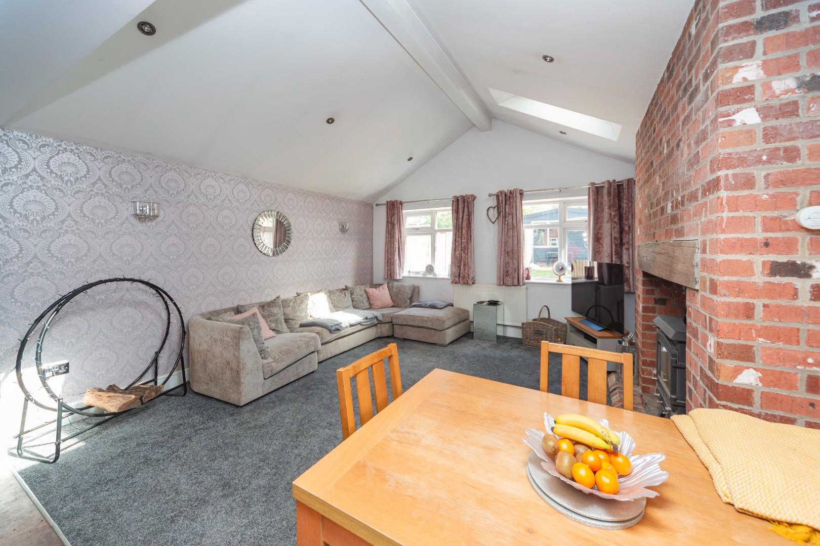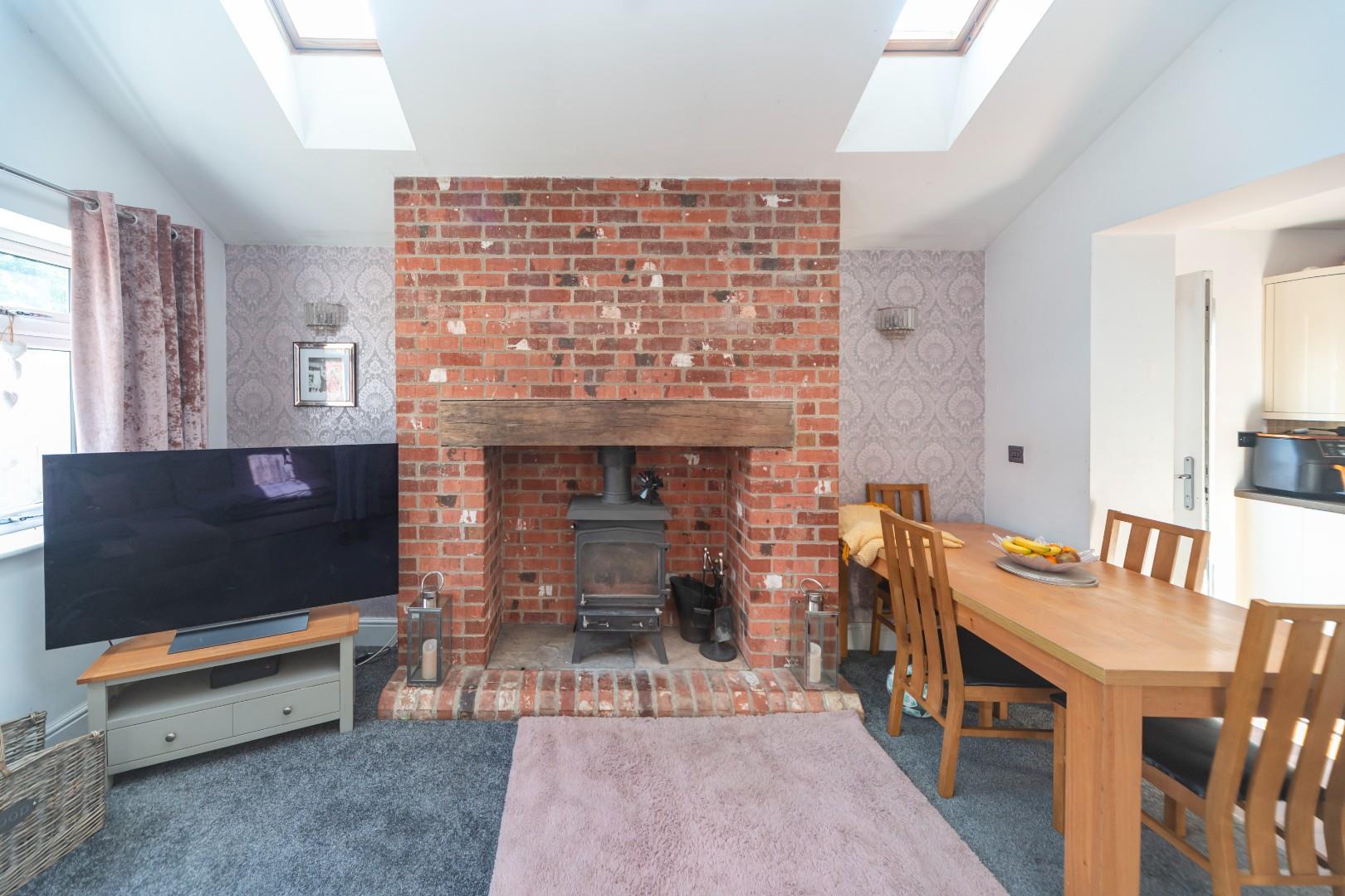 Has two windows to the rear aspect, two Velux windows, door to outside, the lounge and dining area has a feature brick chimney breast wall with oak mantle and multi fuel burner inset. The kitchen area is fitted with a range of base cupboards, drawers, matching wall mounted cabinets and island unit, integrated appliances include a dishwasher, oven and microwave. There is recessed ceiling down lights, tiled splashbacks, composite sink with mixer taps over and a four ring electric hob with extractor over, a door leads through to the down stairs utility and shower room.