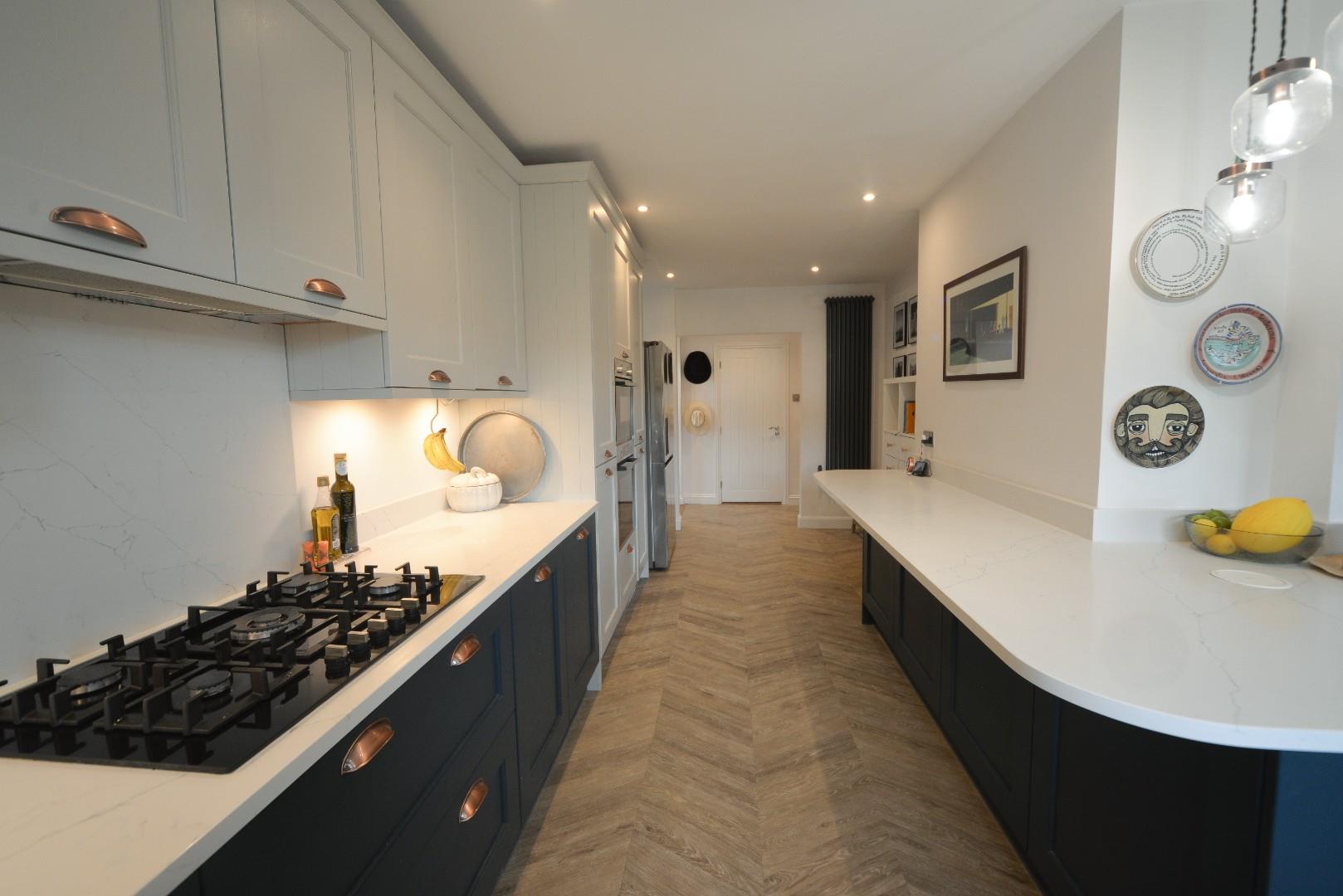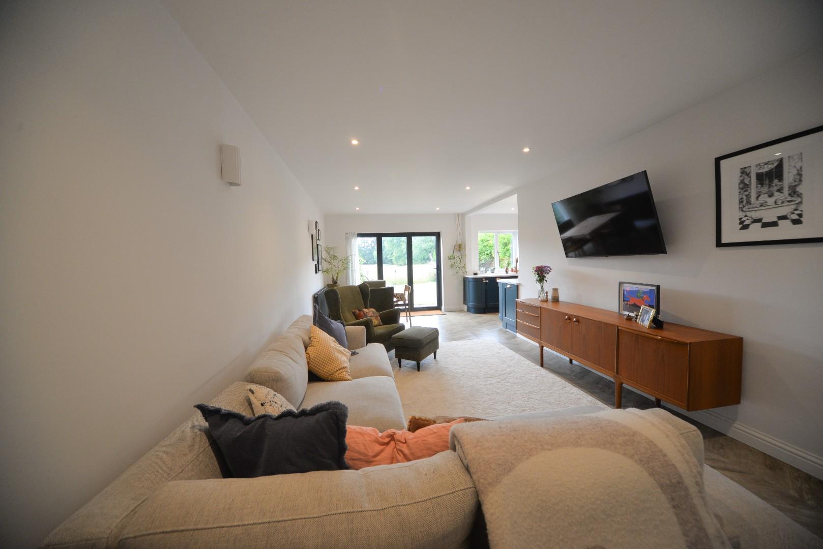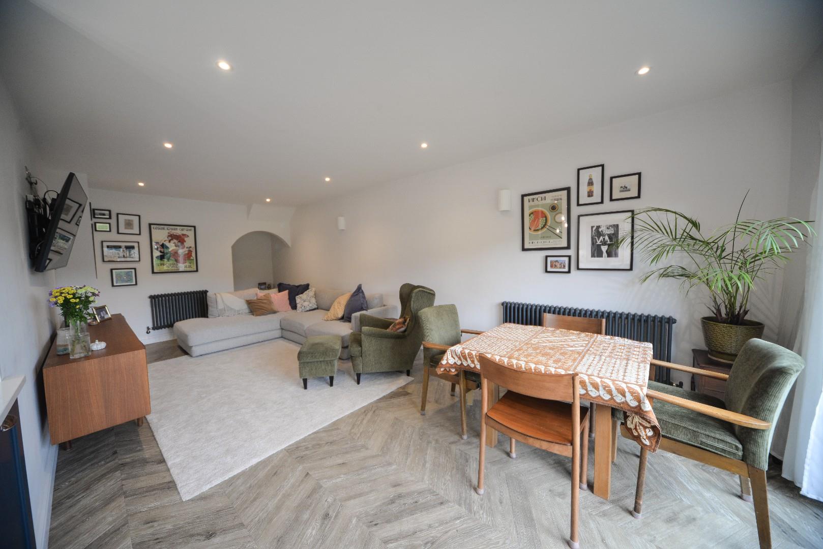 Has bi fold doors looking out over the rear patio and garden, the wood effect flooring continues through, there are period style radiators and recessed ceiling down lights.