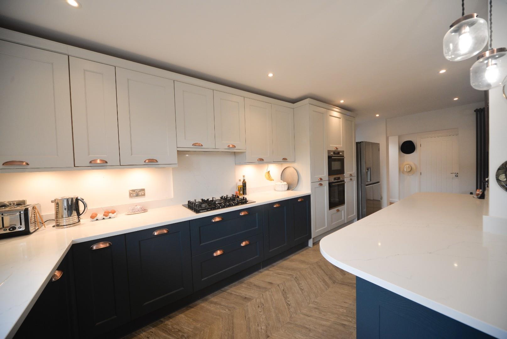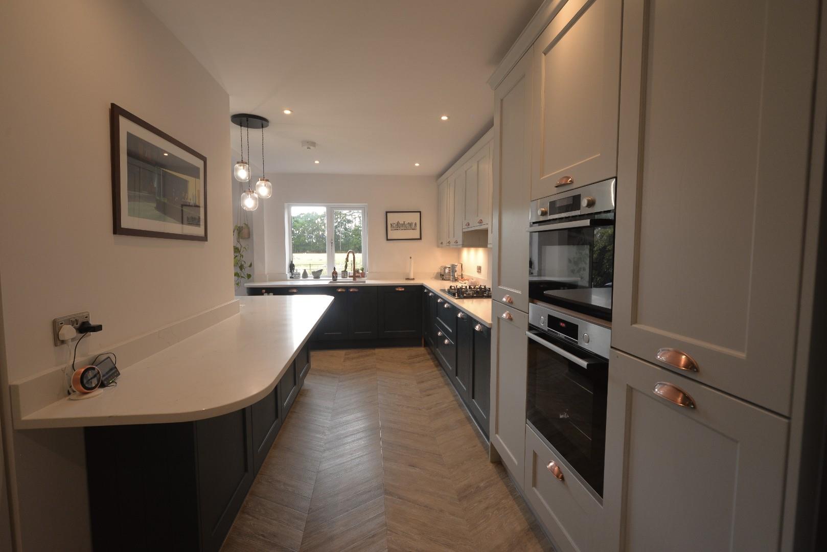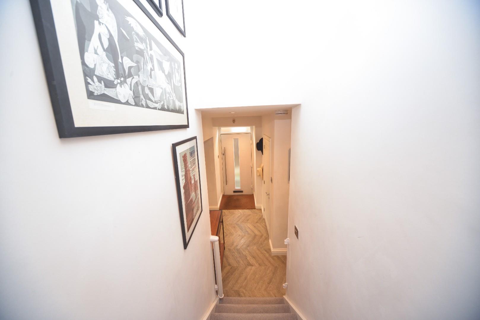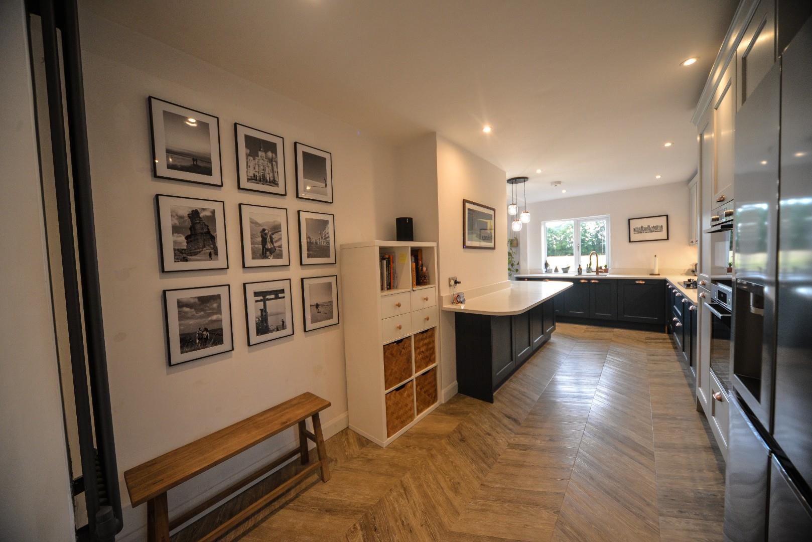 Having stairs off to firsts floor, doors to bedrooms two and three and wet room. There is an attractive wood style flooring, recessed ceiling down lights and a wide opening lesding into the beautifully fitted kitchen.