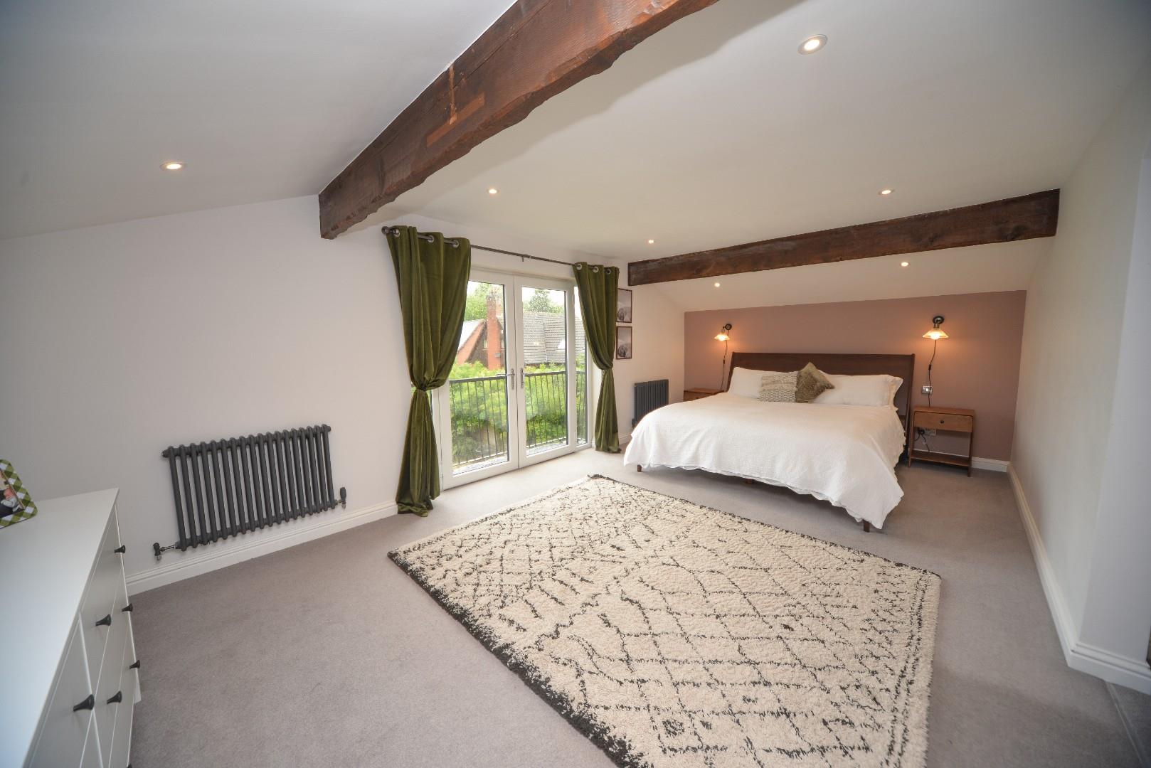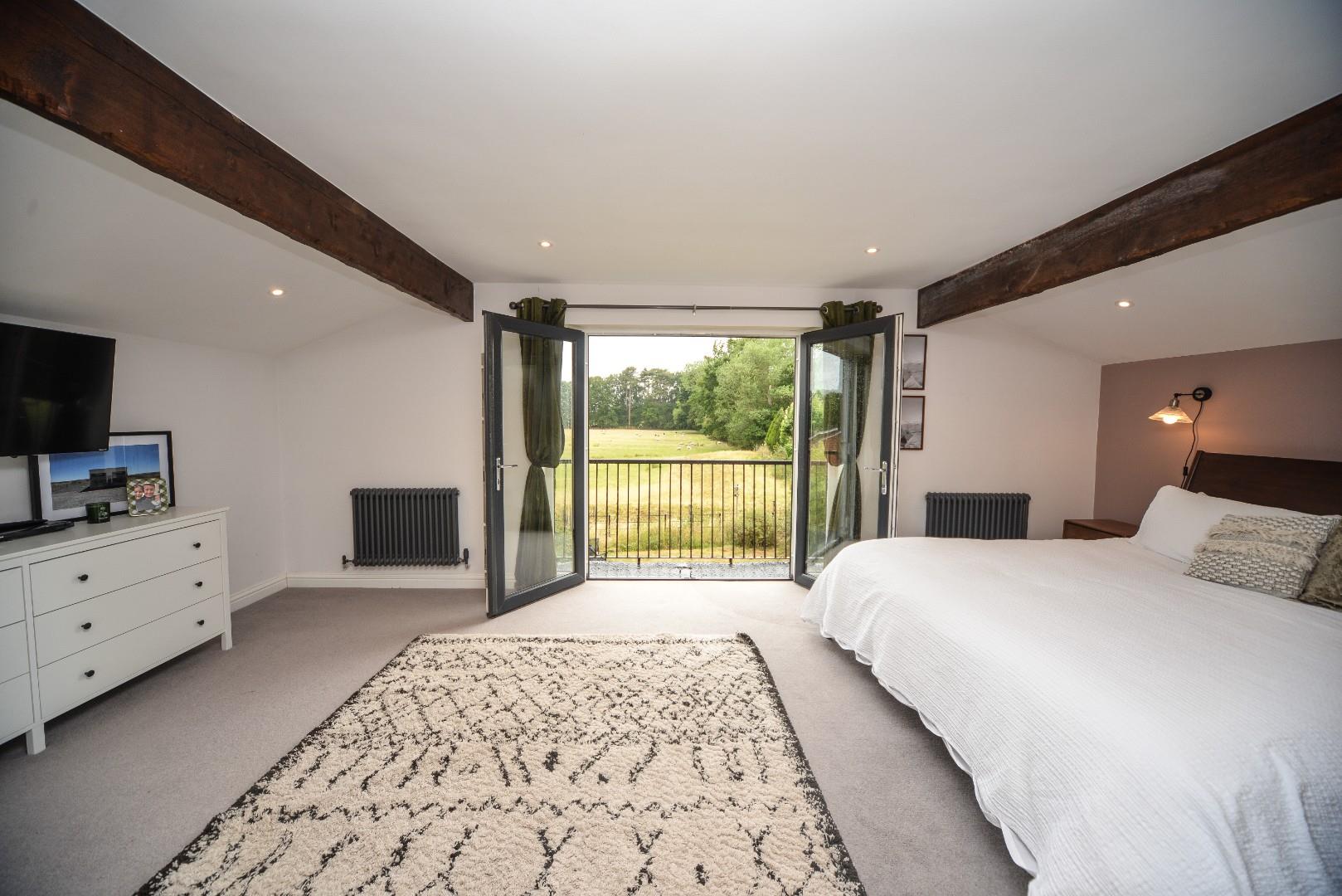 This superb space has recessed ceiling down lights, exposed timbers to ceiling, period style radiator and the superb focal point of the room is French doors with glazed panels opening up onto a balcony with views over the garden and the field beyond.