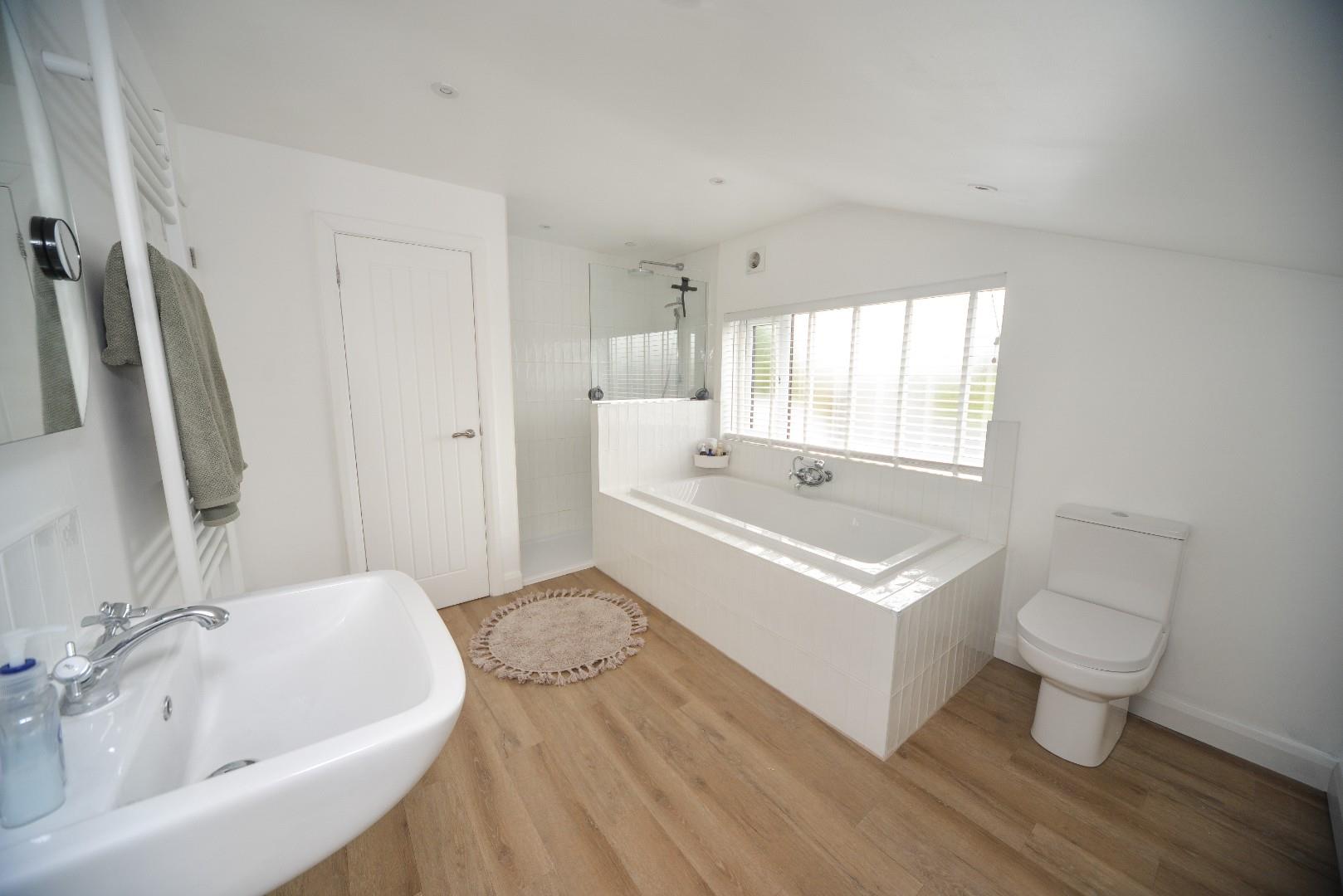 Has a large walk in shower with waterfall and hand held heads, large sunken slipper bath with mixer taps with shower attachment, W.C. and wall mounted hand wash basin with tiled splashbacks, there is a heated towel rail, obscure window to the rear aspect, built in linen storage and a further door that opens through into a further eaves storage space.