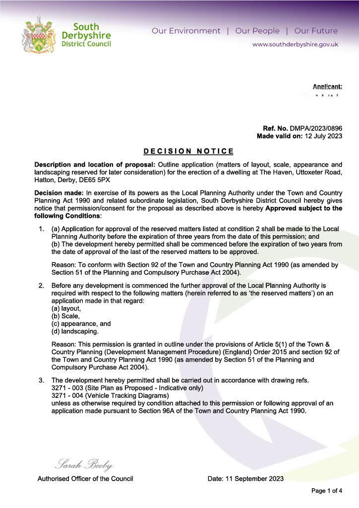 South Derbyshire District Council has granted outline planning permission for a detached dwelling under reference number DMPA/2023/0896. The site is adjacent to The Haven. Prospective buyers will be responsible for demolishing the existing garage, clearing the site, and securing the boundaries.