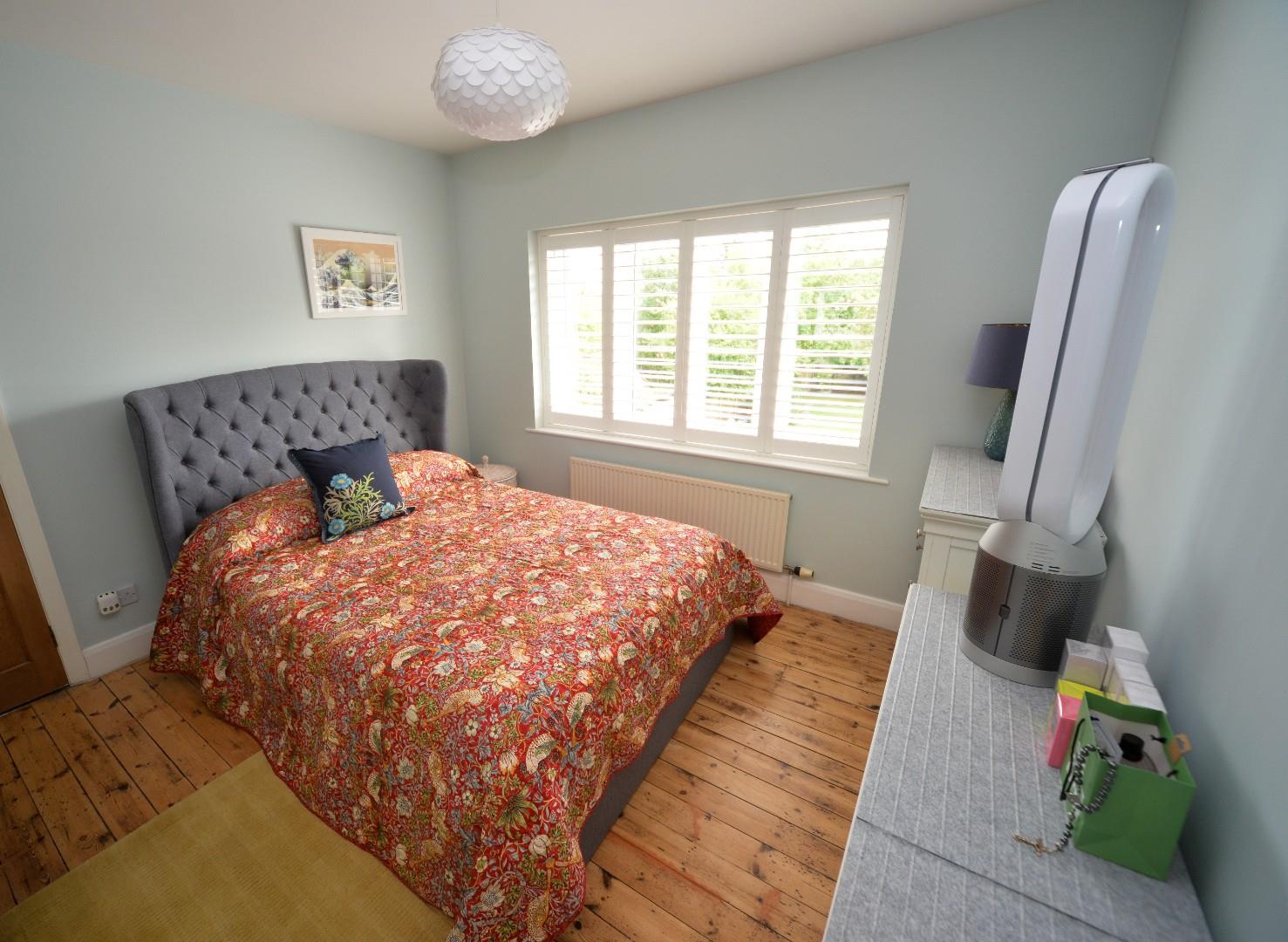 A lovely bedroom with neutral decor, window to the front aspect with bespoke shutters, radiator, ceiling light point and original stripped floor boards.