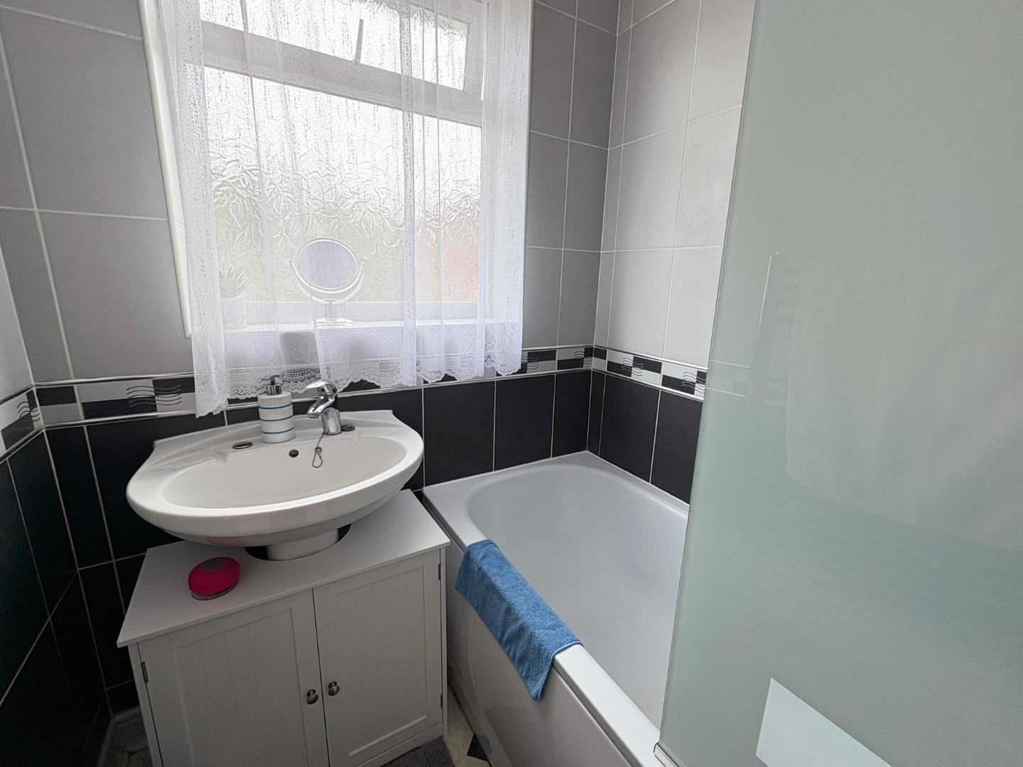 Has a panelled with mixer taps and shower attachment, pedestal hand wash bsain, tiled surrounds, ceiling light point, heated chrome towel rail and obscure window to the rear aspect.