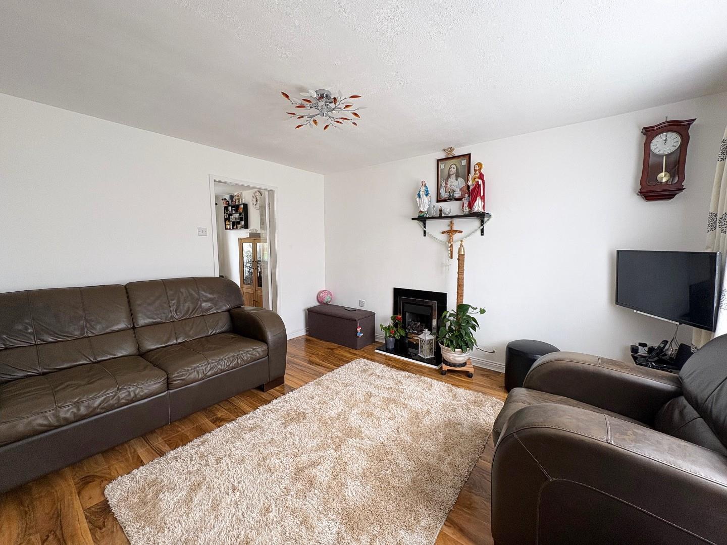 Has a continuation of the attractive wood effect flooring, a window to the front aspect, radiator, ceiling light point, door to dining room and the focal point of the room is a gas living flame fire.