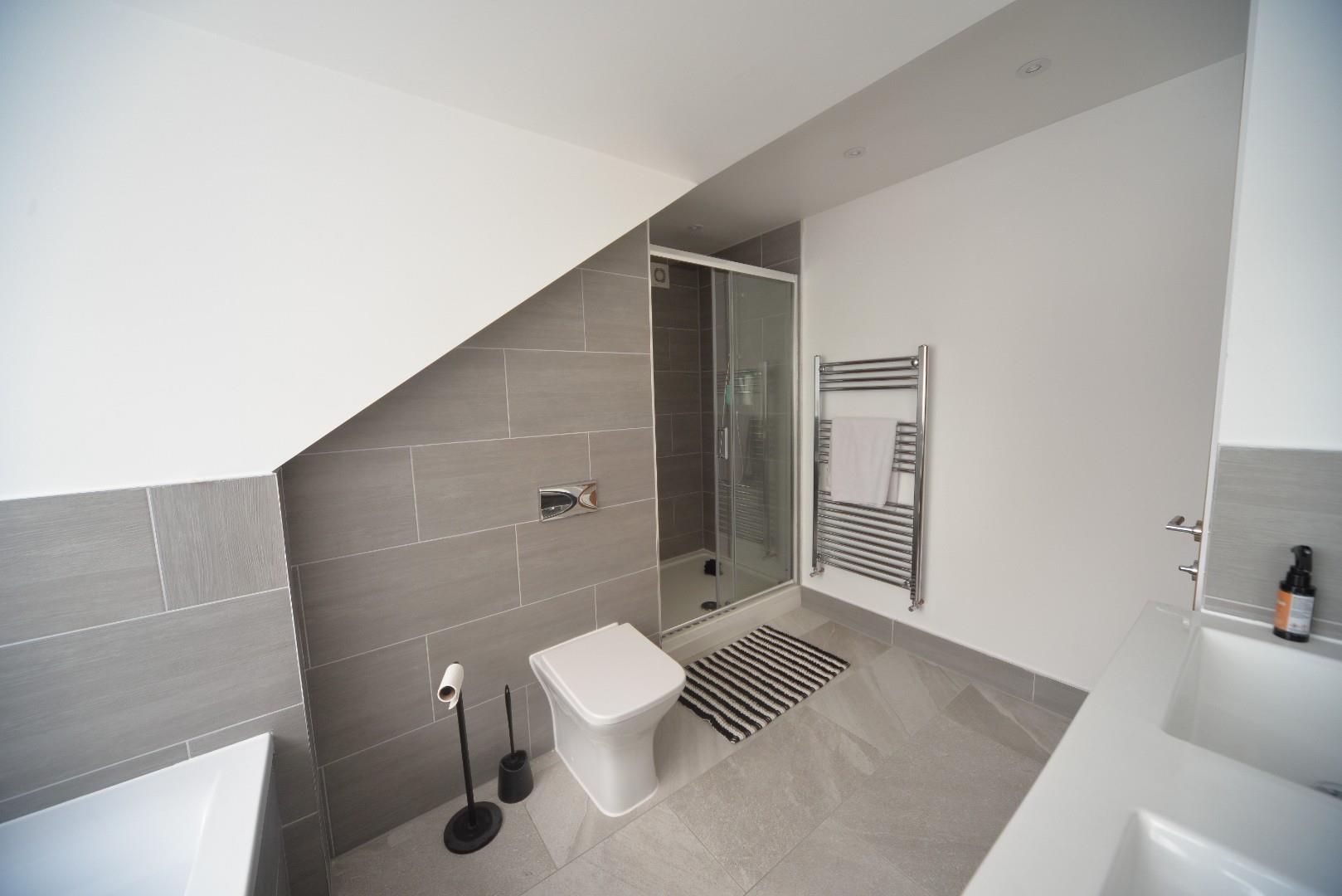 A luxury fitted bathroom with a slipper bath with mixer taps over, fitted W.C., large fully tiled shower enclosure with glazed screen and dual head showers, vanity unit with drawer storage, and hand wash basin with mixer taps. There is an obscure window to the rear aspect, recessed ceiling down lights, tiled surrounds and contrasting floor tiles,