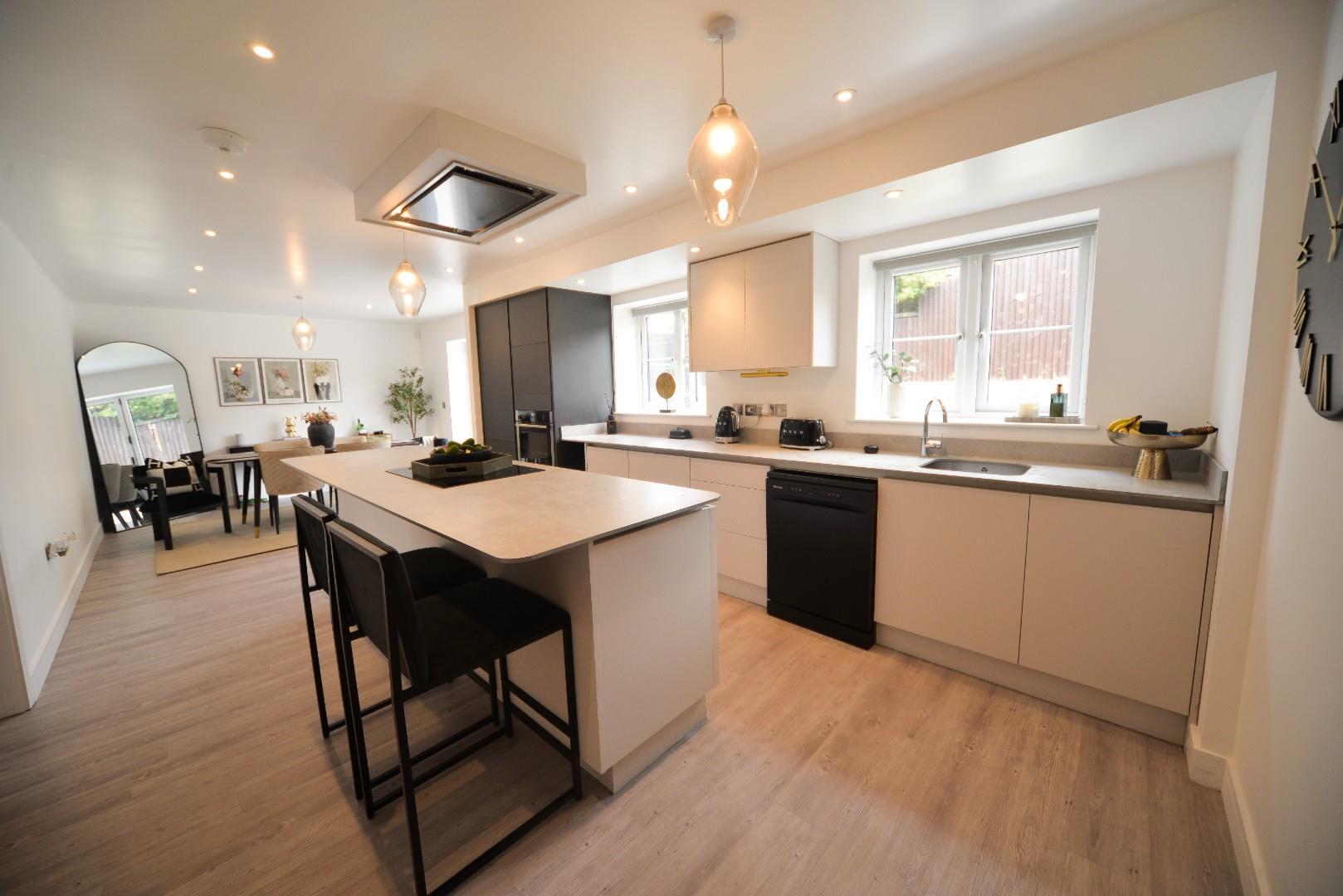 This space is superbly equipped with contrasting base cupboards, drawers and wall-mounted cabinets. The worktops are inset with a four-ring electric hob and stainless steel sink with mixer taps; integrated appliances include an oven, fridge, freezer and space for a dishwasher; there is a Neff extractor fan, recessed ceiling down lights, ceiling light points, wood effect flooring. Tri-fold doors lead out onto the rear patio, there are two further windows looking out onto the rear garden and a wide opening through to the utility area.