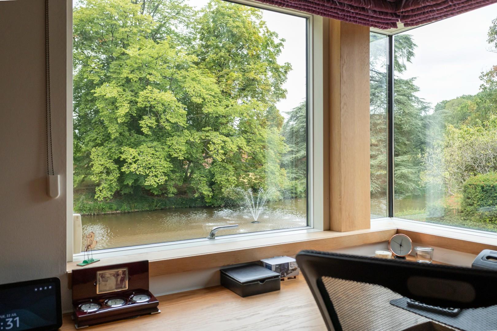 The sitting room offers an oasis of calm, featuring magnificent views of the lake and one of the beautiful fountains—who needs a TV with this view? Full-length windows flood the space with light. Air conditioning ensures comfortable temperatures all year-round, and a bio ethanol fire serves as both a focal point and a source of warmth on cooler evenings.