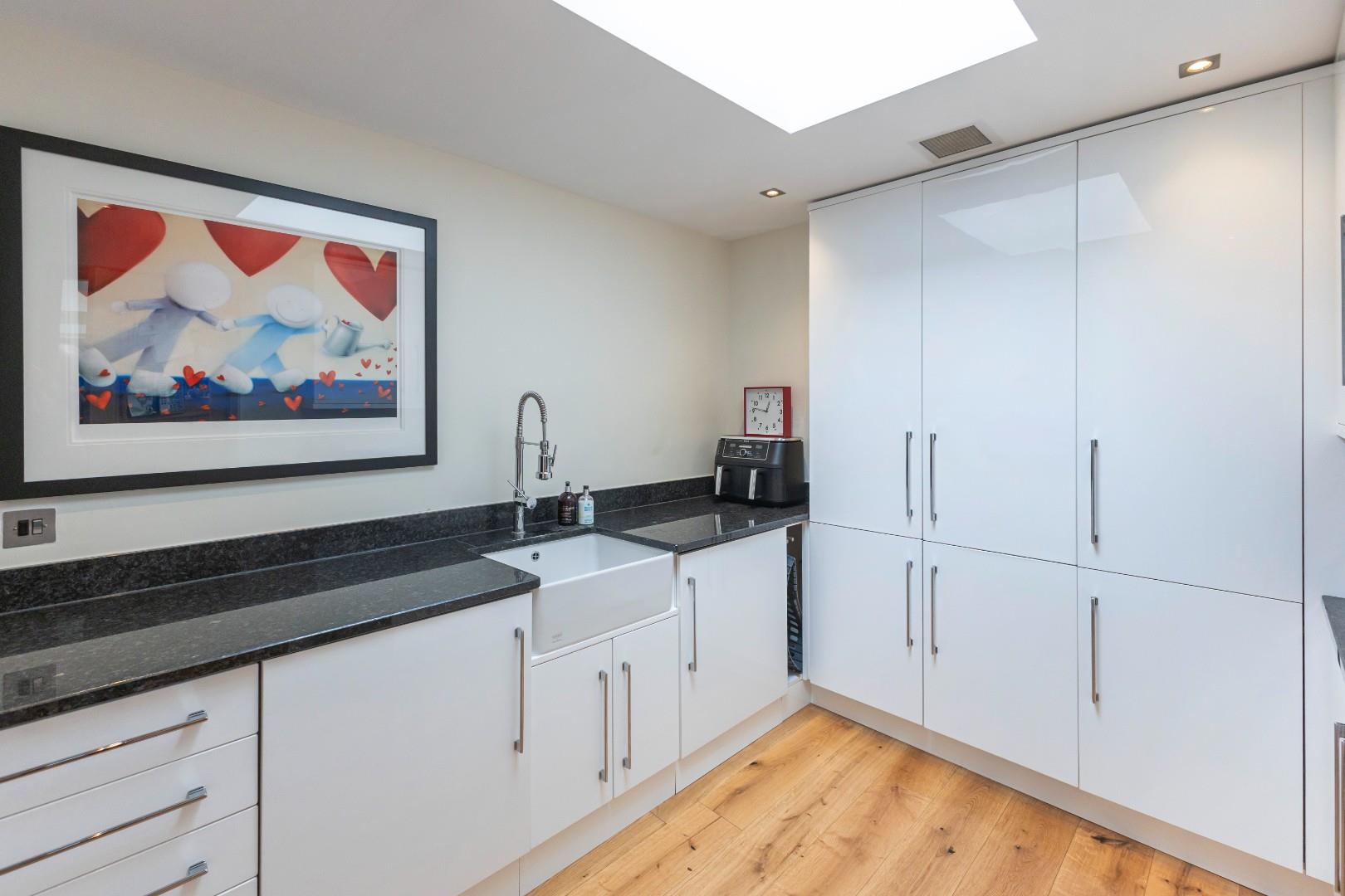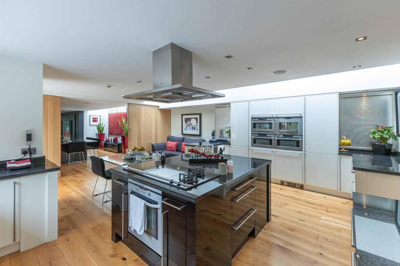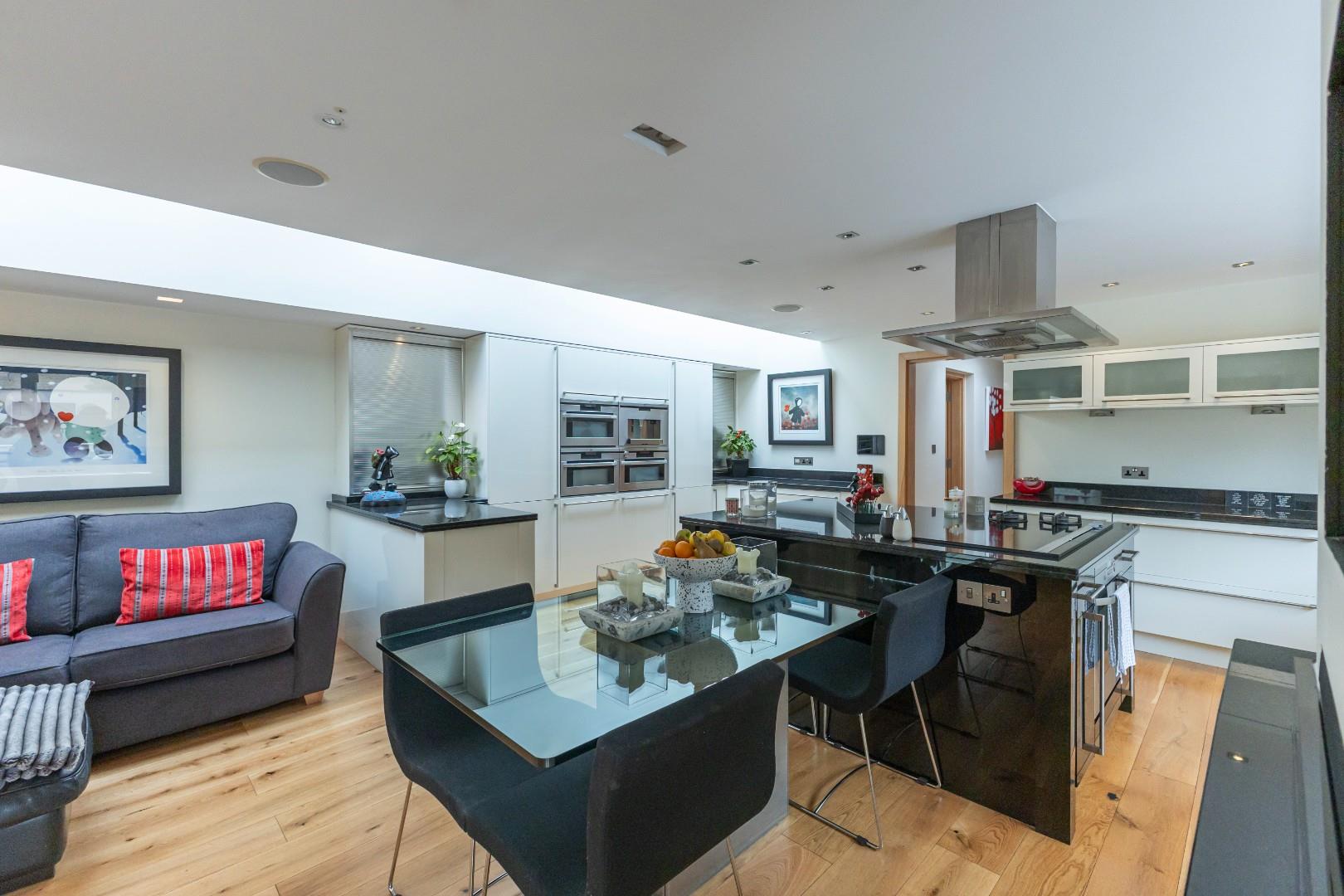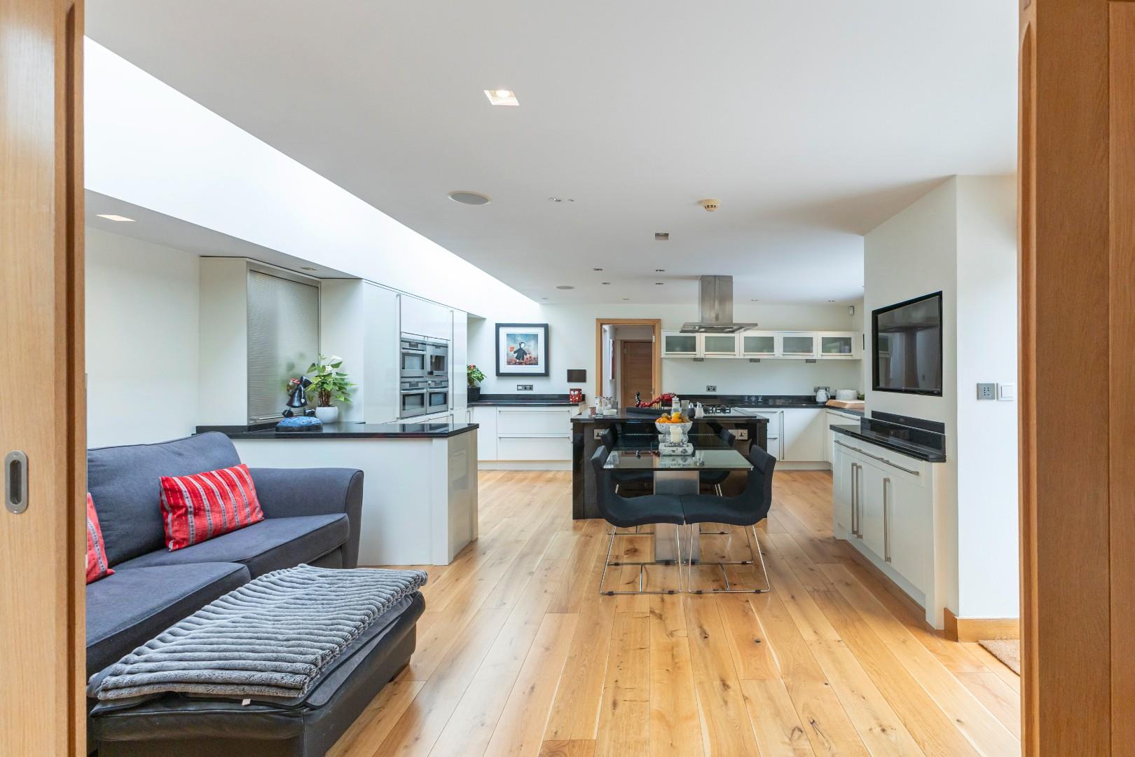 This single-storey, flexible accommodation features an entrance hallway with engineered oak flooring that flows through much of the residence, leading to the fabulous living and kitchen area. The kitchen impresses with a superb selection of fitted cabinets and larder units, including fridge drawers, warming drawers, a dishwasher, an integrated oven, a steam oven, a microwave, and a coffee machine. An island equipped with gas, electric, and induction hobs enhances the cooking experience for even the most discerning cook. A glass breakfast table extends from the island, and ample space accommodates a sofa. A full-glazed door opens to an impressive private courtyard terrace, while glazed roof lights provide additional natural illumination. Oak sliding doors lead into the dining area, creating a spacious setting ideal for entertaining.