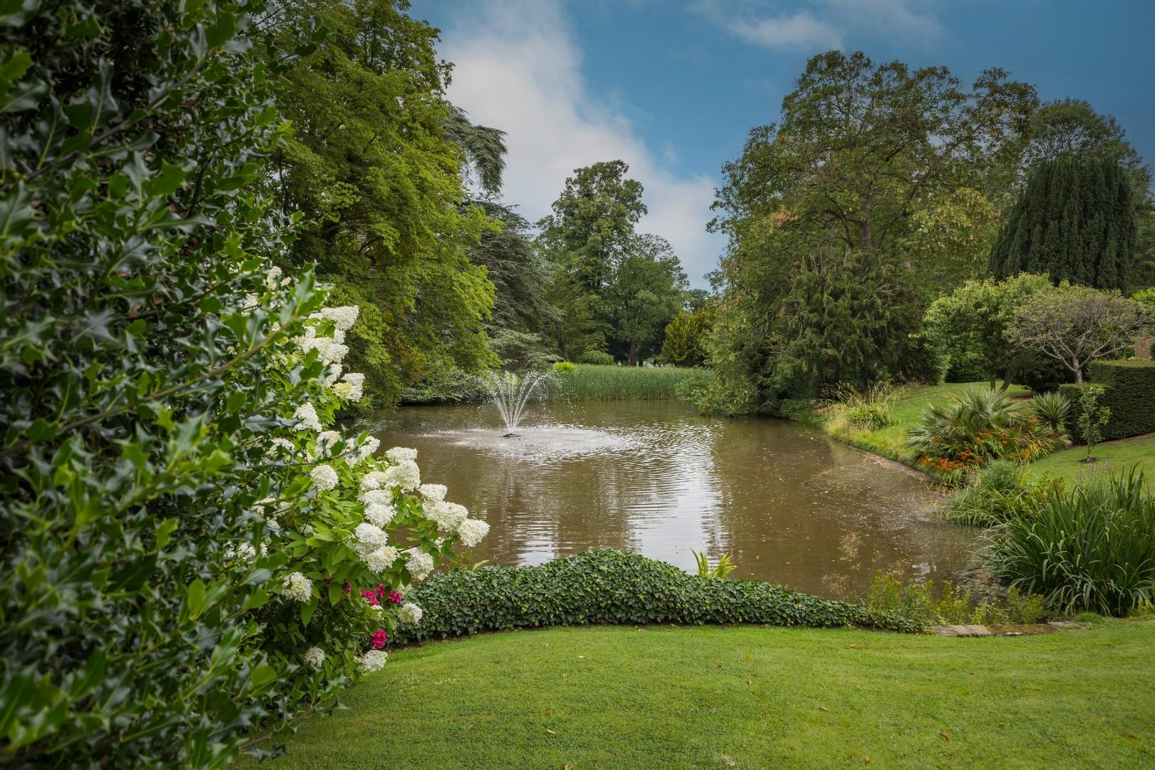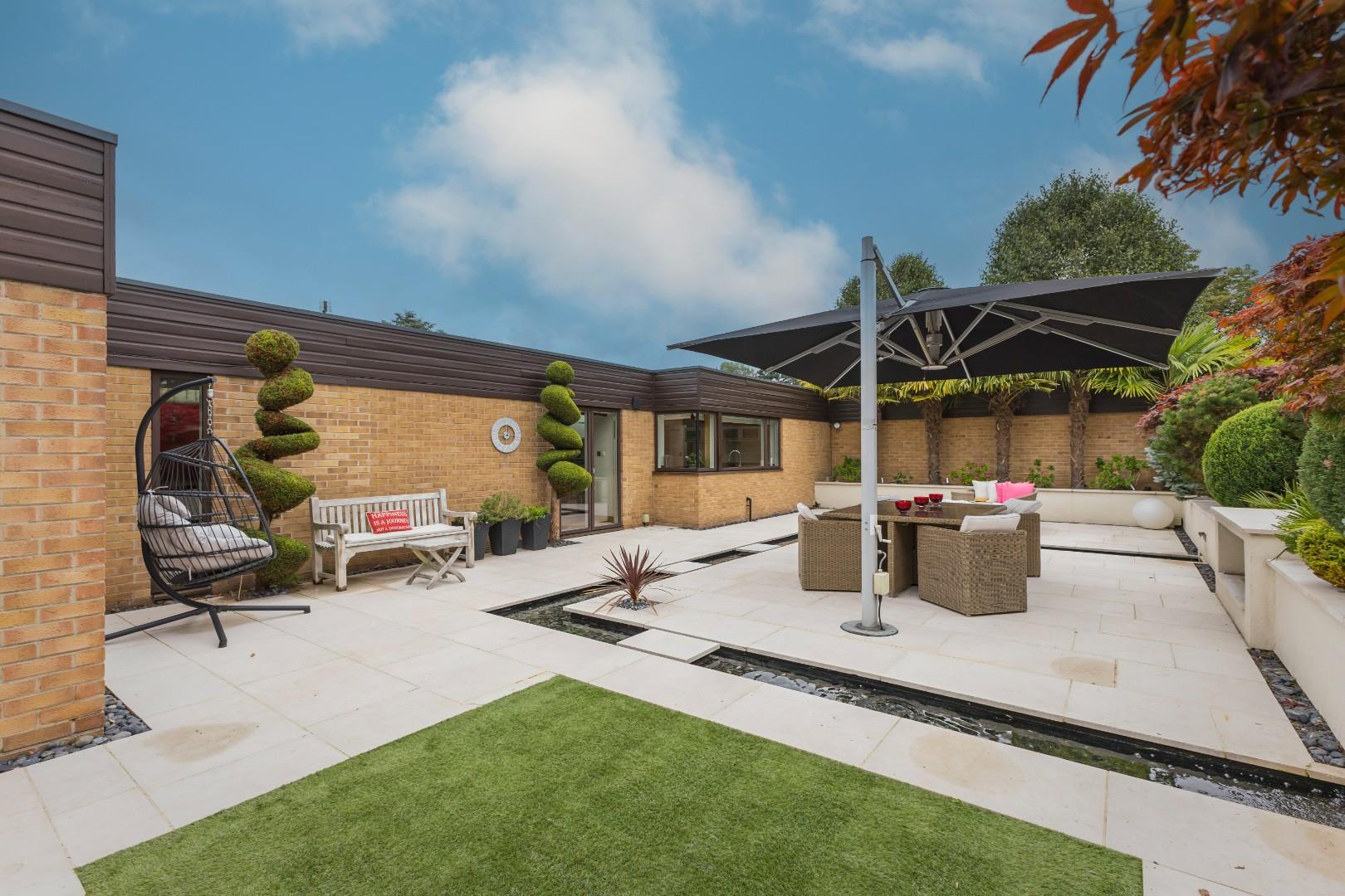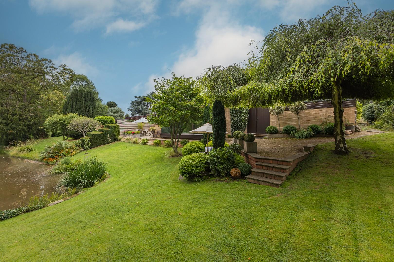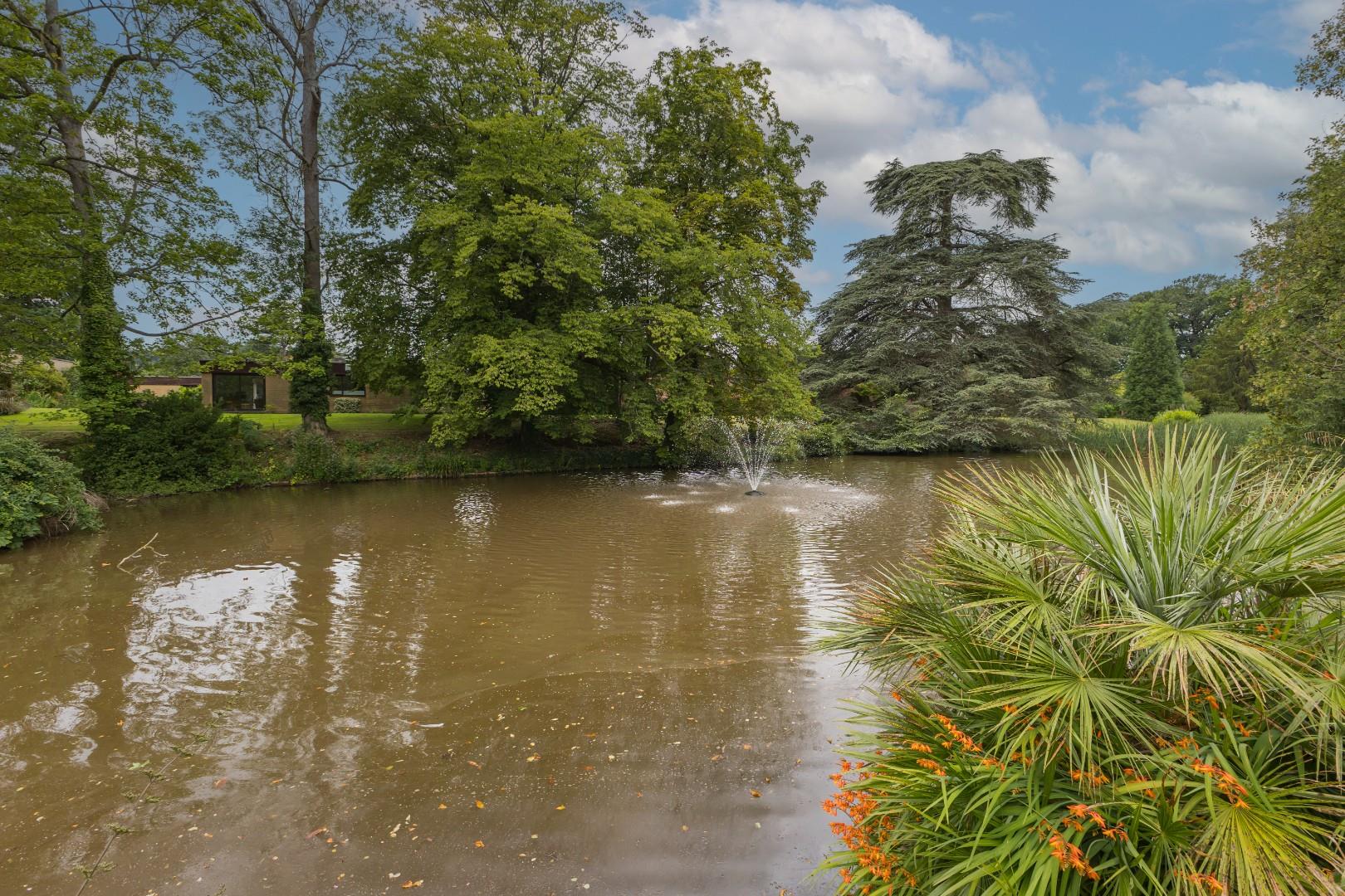 This beautiful, architecturally striking residence has been meticulously rebuilt to the highest standards by the current owners, creating an impressive home designed for the 21st century. Nestled in a serene parkland environment, the property is adorned with lush woodland paths and a tranquil lake, enhanced by the soothing sounds of cascading fountains. It offers a harmonious blend of nature and everyday living.