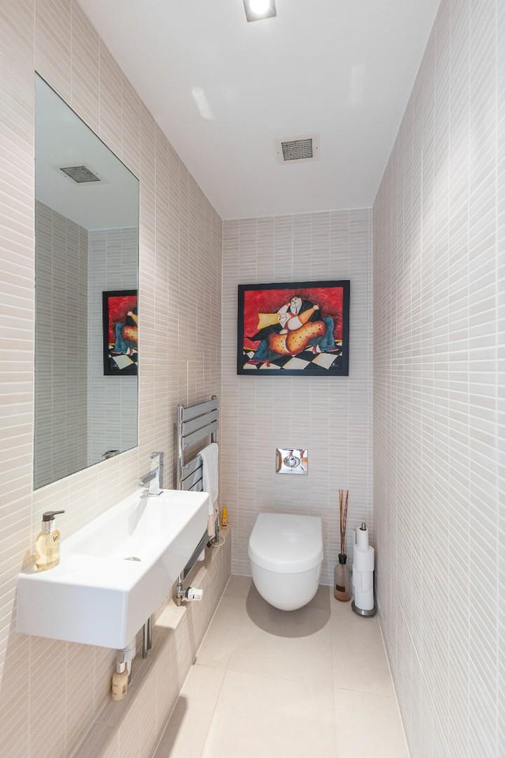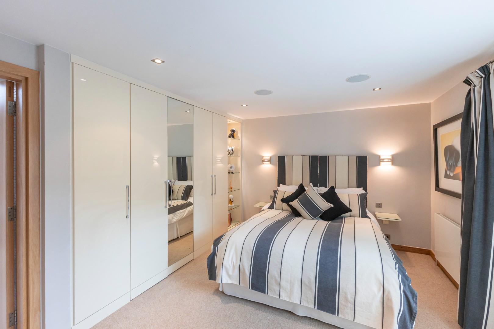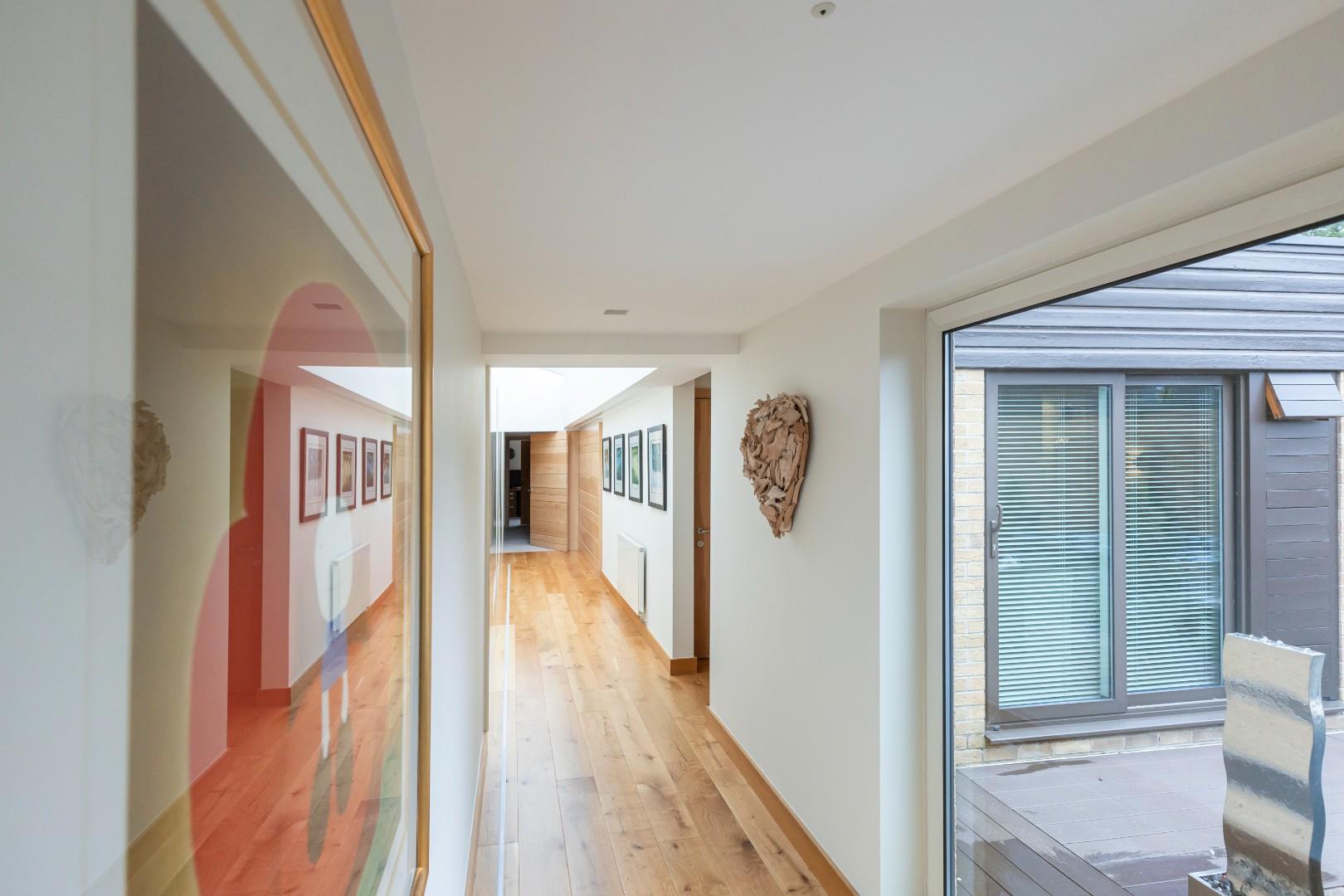 The bedroom wing features an expansive corridor that houses various storage cupboards containing electronics for the house management system. A guest cloakroom is also accessible from the lobby.