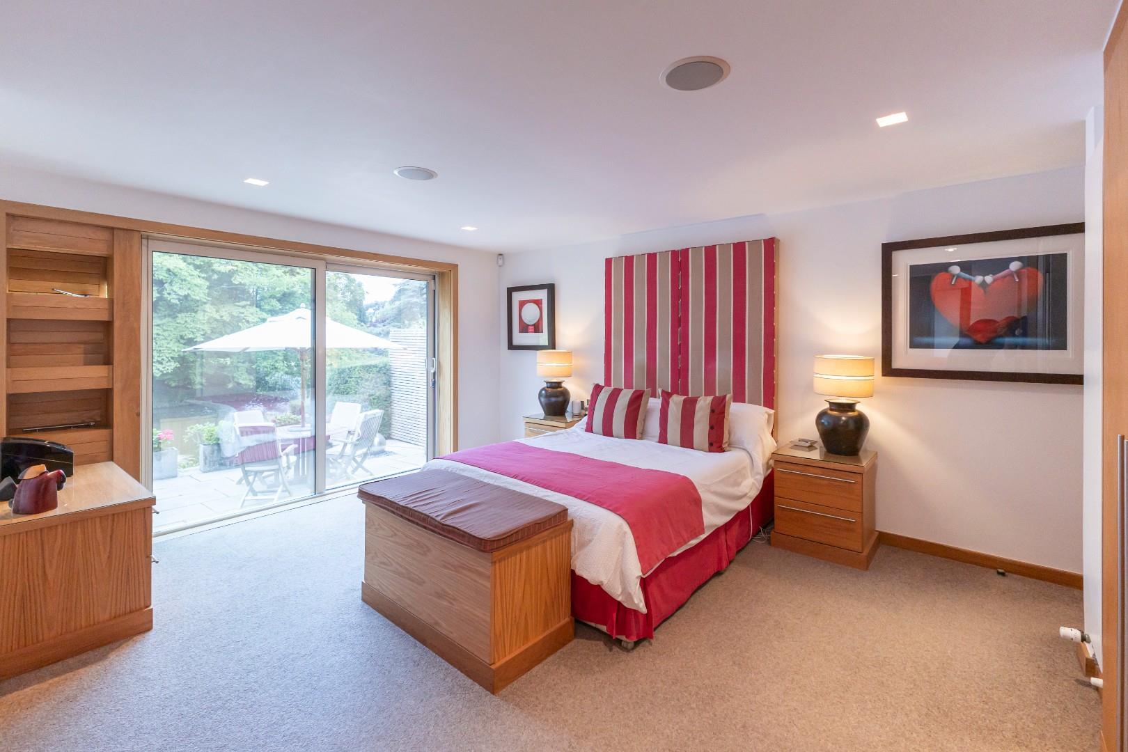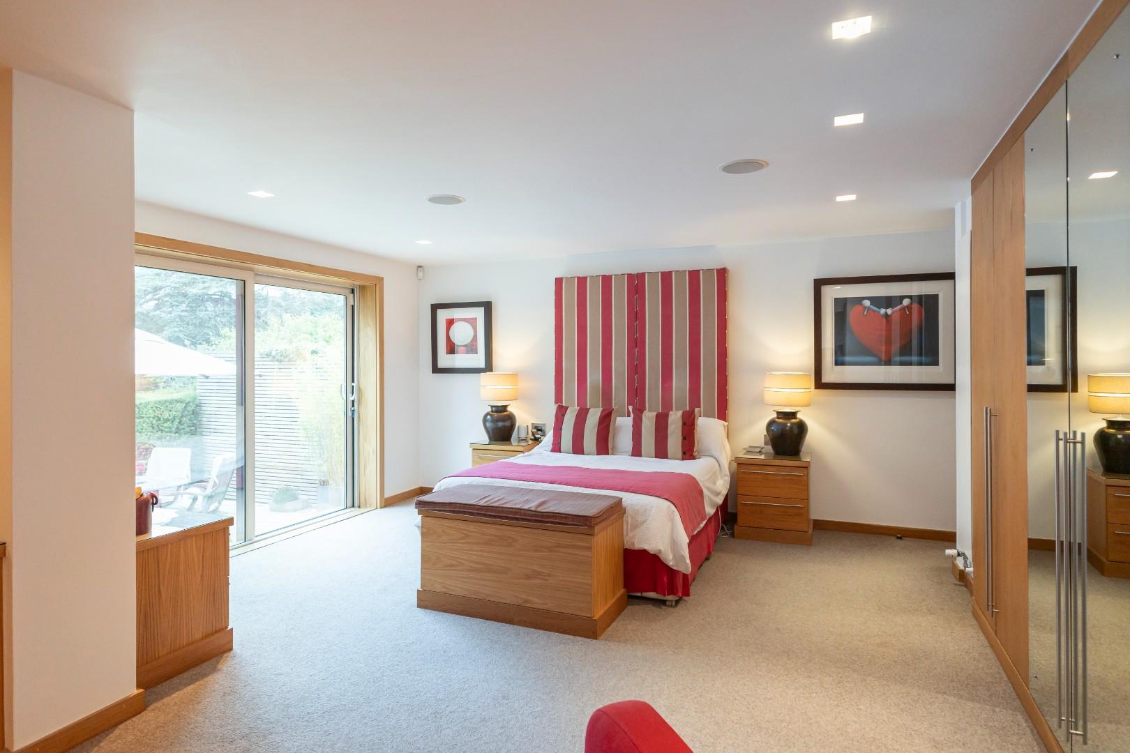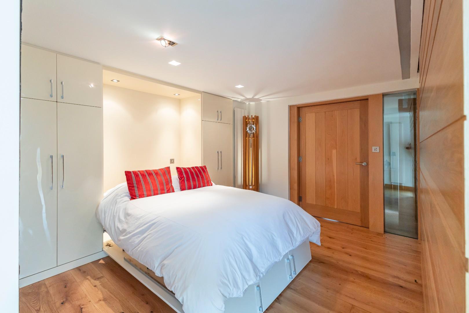 For extra guests, there is a large lobby area off the entrance hall, equipped with sliding oak doors that can close off the space from the bedroom lobby, complete with a range of cupboards that feature a pull-down double bed and tv.