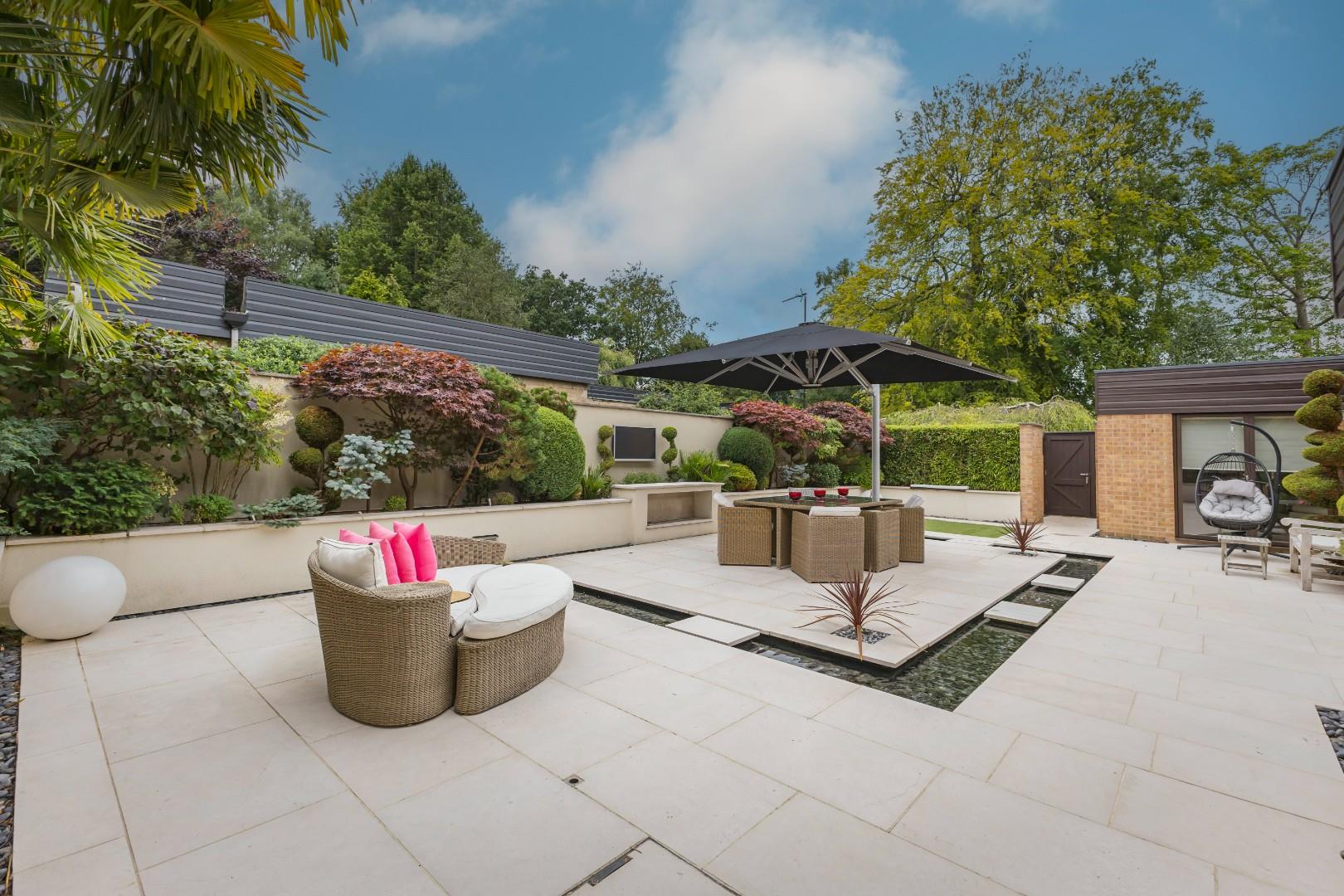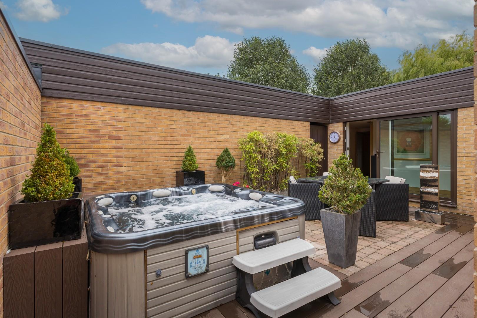 A further secluded paved patio, equipped with mood lighting, includes a hot tub and a water fountain.