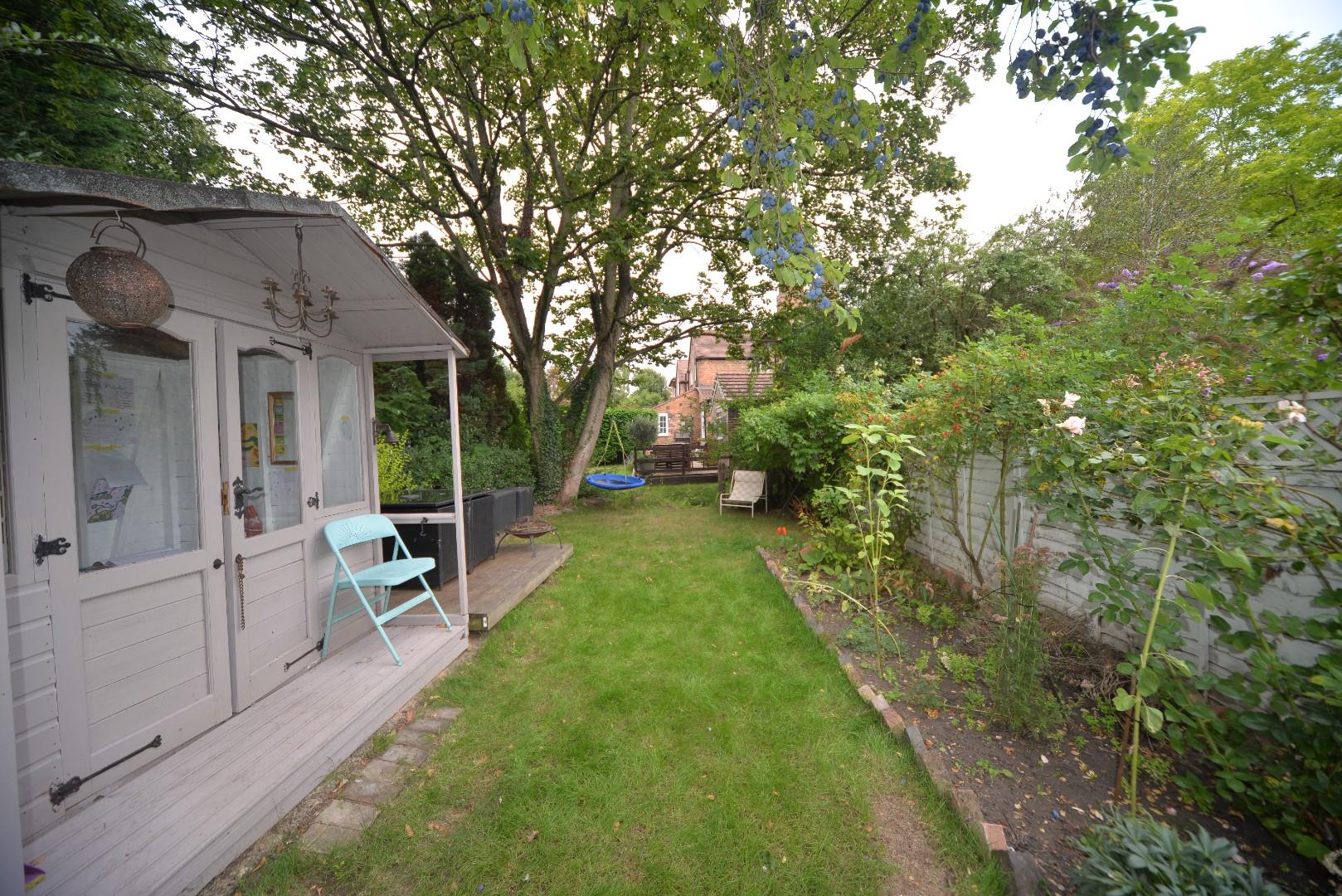 To the front of the property is a walled frontage with a gate and path leading to the front door with a small fore garden filled with herbaceous planting. To the rear is an attractive cottage style court yard with period style blue brick tiles and a decked terraced area with herbaceous planting, there is also an outhouse for storage which then leads on to a communal path where at the end a further private garden can be found which is laid to lawn with herbaceous borders, summer house, cottage style planting, terrace and overlooks the brook.