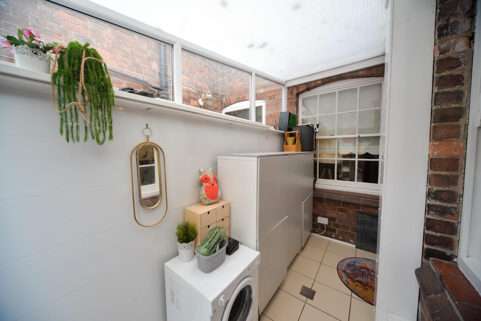 Incorporates a range of solid wood hand painted base cupboards, drawers and matching wall mounted cabinets over, solid wood work preparation surfaces with matching upstands are inset with a one and a half sink with mixer tap over and a Neff induction hob with integrated oven beneath, there is an integrated dishwasher, fridge freezer, a door leads into the conservatory and there are two windows that look out to the side aspect, there is ample space for dining table and chairs.