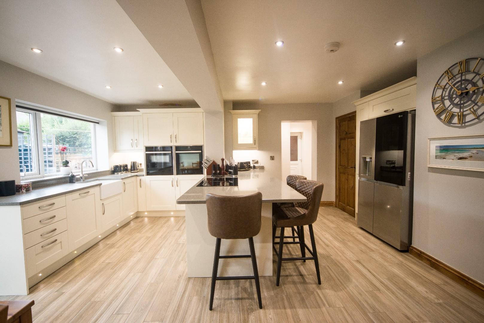 Has base cupboards with work tops over, matching wall mounted cabinets, there is provision for washing machine, tumble dryer and the domestic hot water and central heating Worcester Bosch oil boiler is also housed here, there are recessed ceiling down lights and a window to the side aspect.