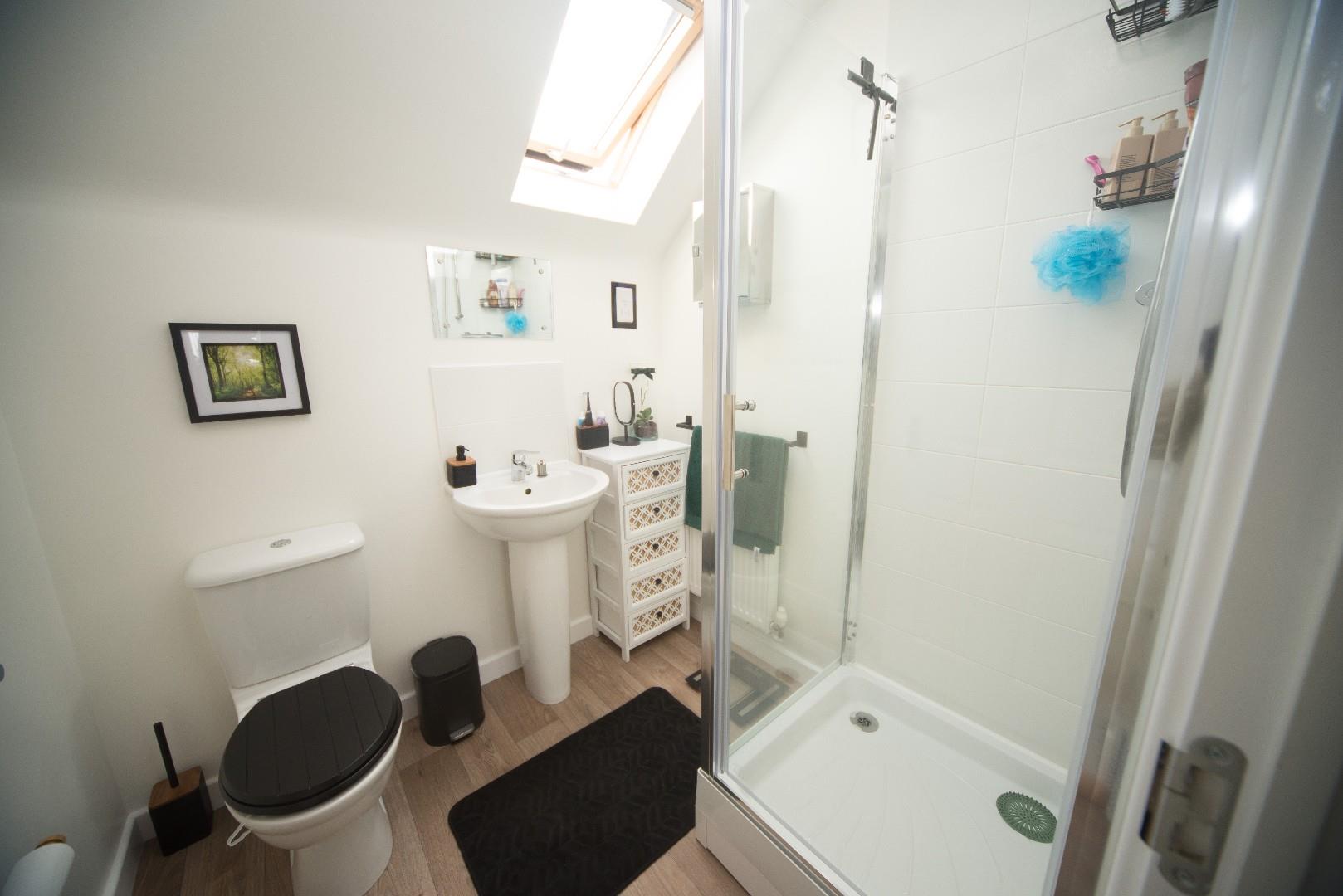 Incorporating a fully tiled corner shower enclosure, pedestal hand wash basin with tiled splashback, Velux window, radiator and ceiling light point. An airing cupboards offer ample space for linen storage and houses the domestic hot water tank.