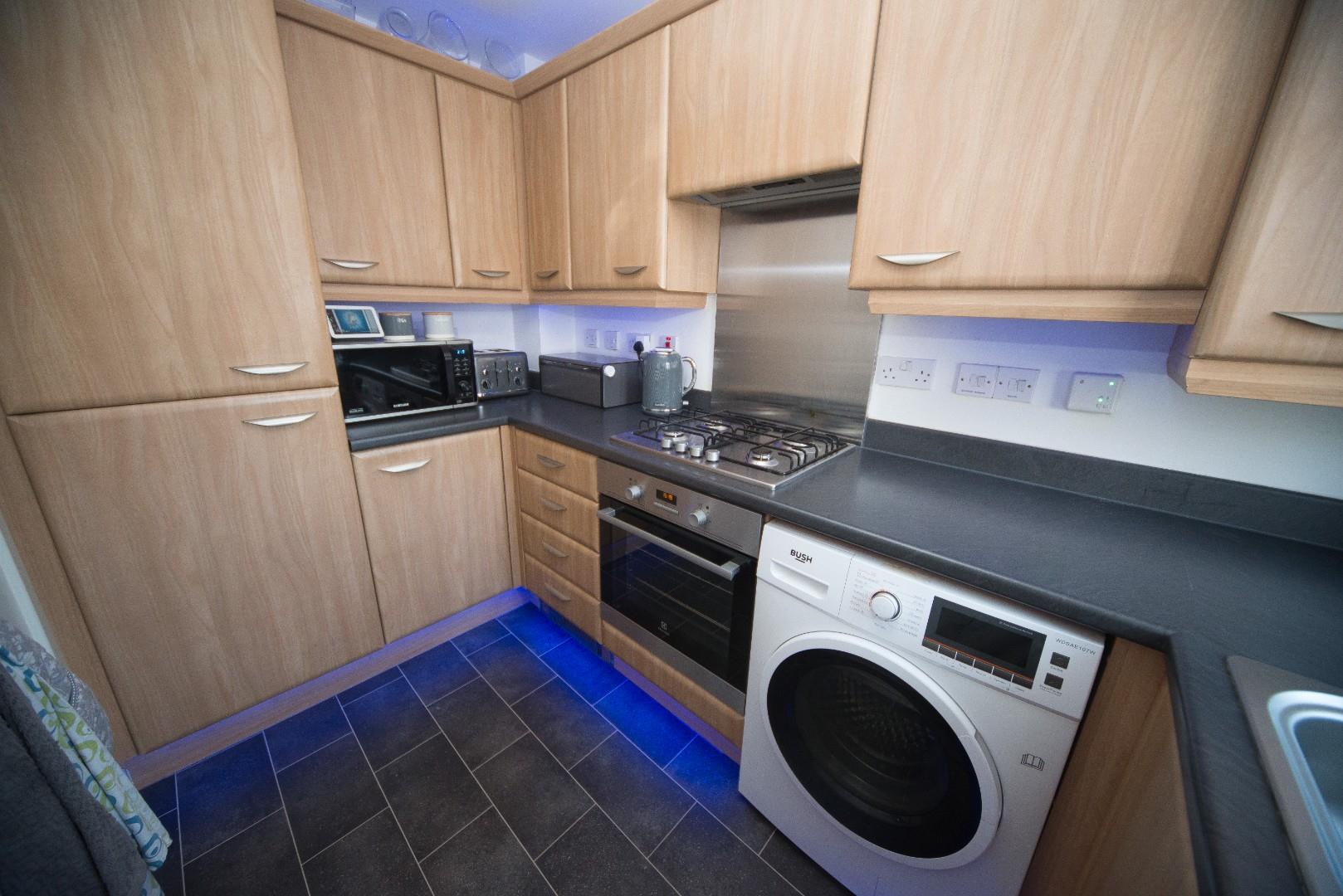 Fitted with a matching range of base cupboards, drawers and wall-mounted cabinets. Integrated appliances include an oven, fridge and freezer. There is space for a washing machine, the domestic hot water and central heating boiler is housed here, and work tops incorporate a one-and-a-quarter sink with side drainer and a four-ring gas hob with extractor fan over. A window looks out to the front aspect, ambience lighting, and a ceiling light point.