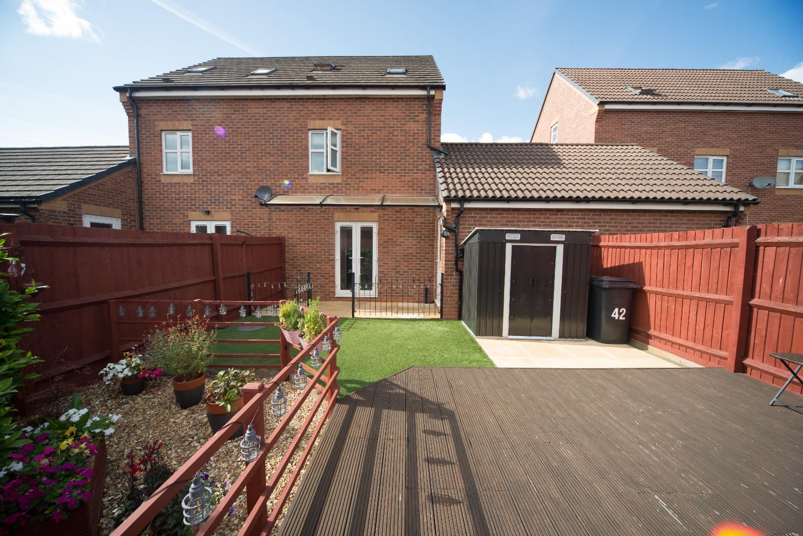 The attractive, low-maintenance rear garden has a paved patio area with a glass overhang. Wrought iron gates open onto the artificial lawn, with a further paved patio, a decked terrace and an enclosed gravelled herbaceous bed.