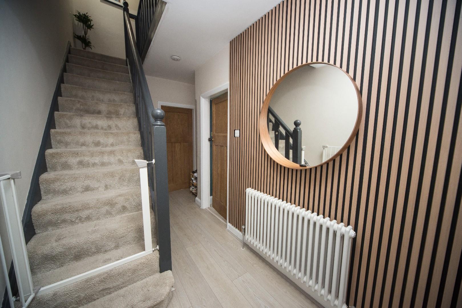 Stairs off to first floor, attractive panelled wall, period style radiator, wood effect flooring, door to dining kitchen and a further door which opens through to the attractively decorated sitting room.