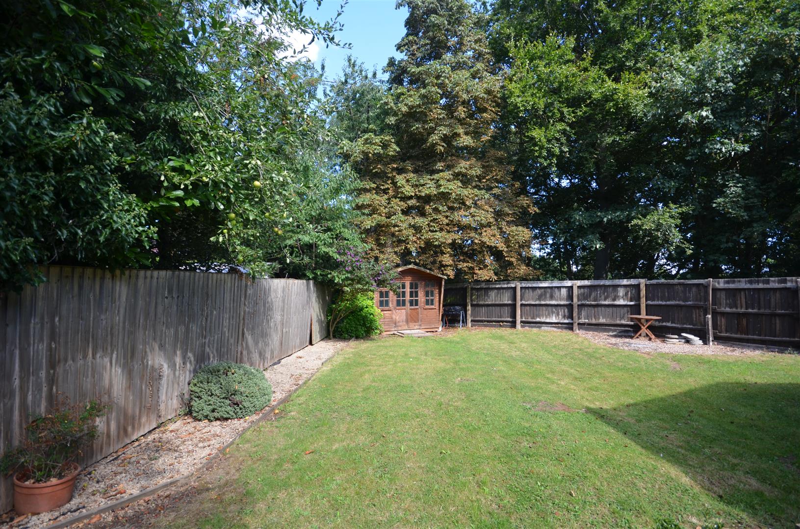 To the rear of the property, a patio area with a large lawned area, fence borders and summerhouse.