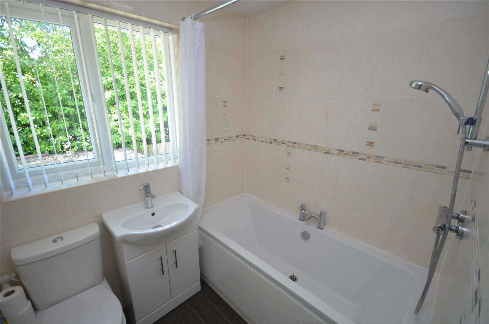 Three piece suite comprising, shower over bath.