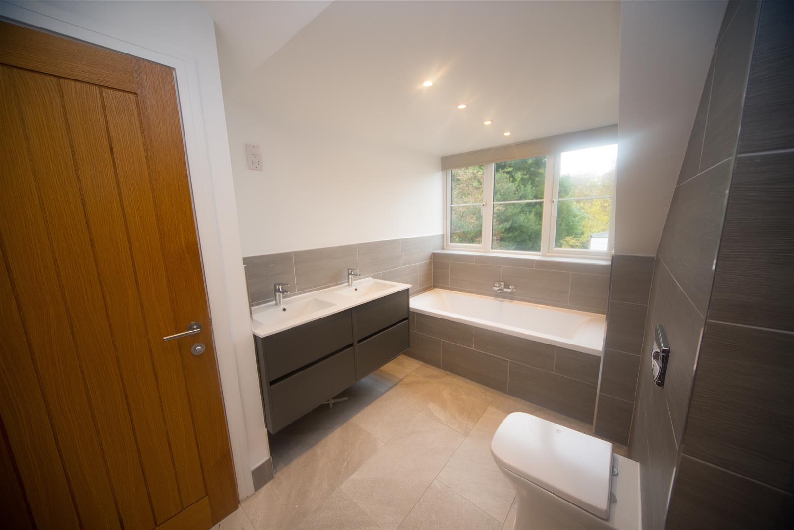 A luxury fitted bathroom with a slipper bath with mixer taps over, fitted W.C., large fully tiled shower enclosure with glazed screen and dual head showers, vanity unit with drawer storage, and hand wash basin with mixer taps. There is an obscure window to the rear aspect, recessed ceiling down lights, tiled surrounds and contrasting floor tiles.