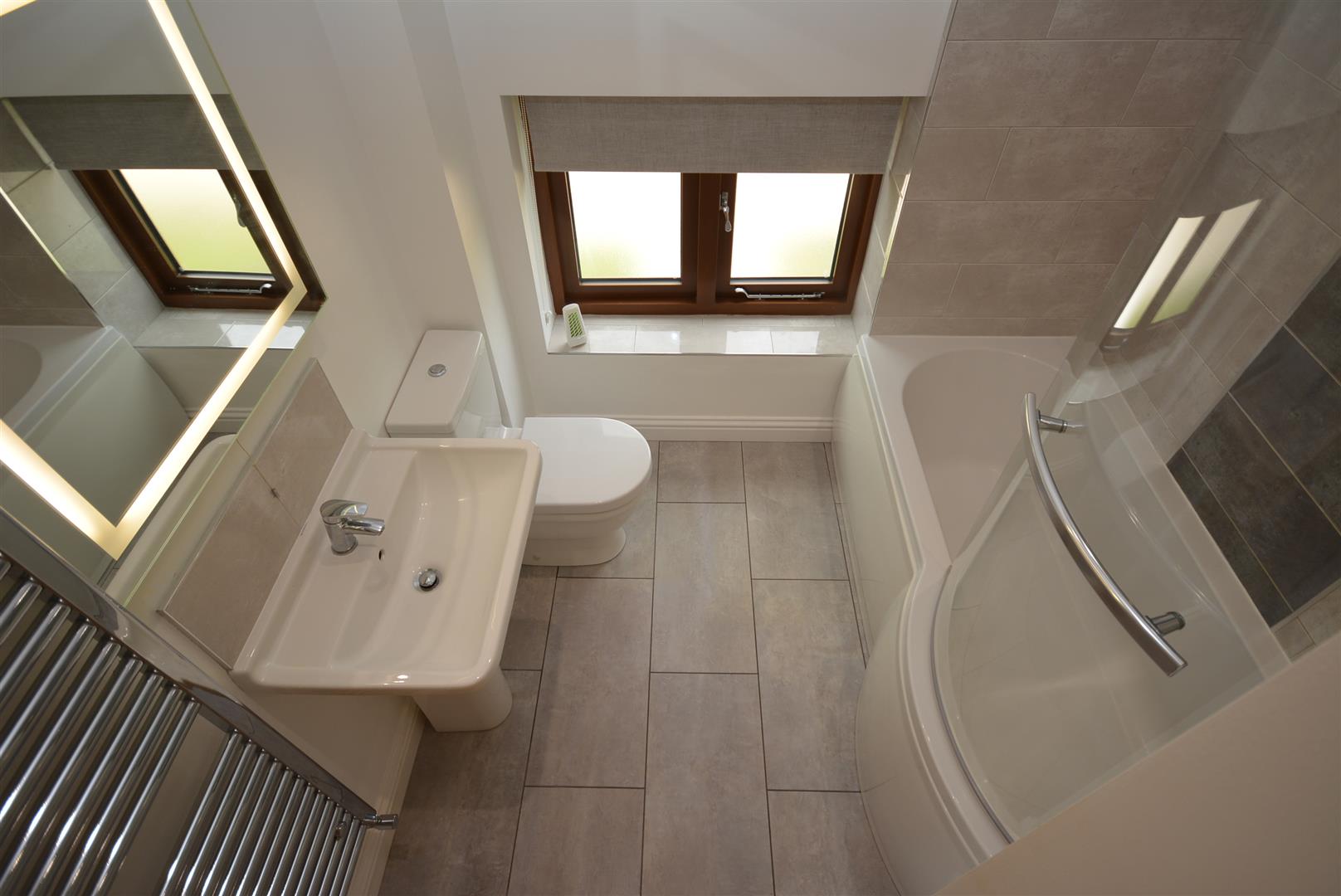 With full suite comprising, p-shaped shower bath with curved glass shower screen and thermostatic mixer shower, low flush w.c., pedestal wash hand basin with illuminated mirror over, complementary ceramic wall tiling, stone effect flooring, centrally heated ladder style towel rail, extractor fan and obscure double glazed window to the front.